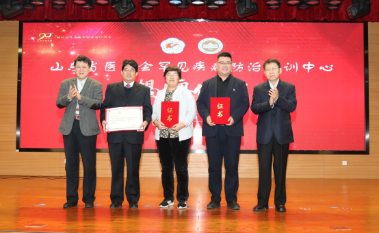 刘岩、赵家军为培训中心三家协作建设单位山东第一医科大学第二附属医院、临沂市人民医院、东营市人民医院代表颁发证书。