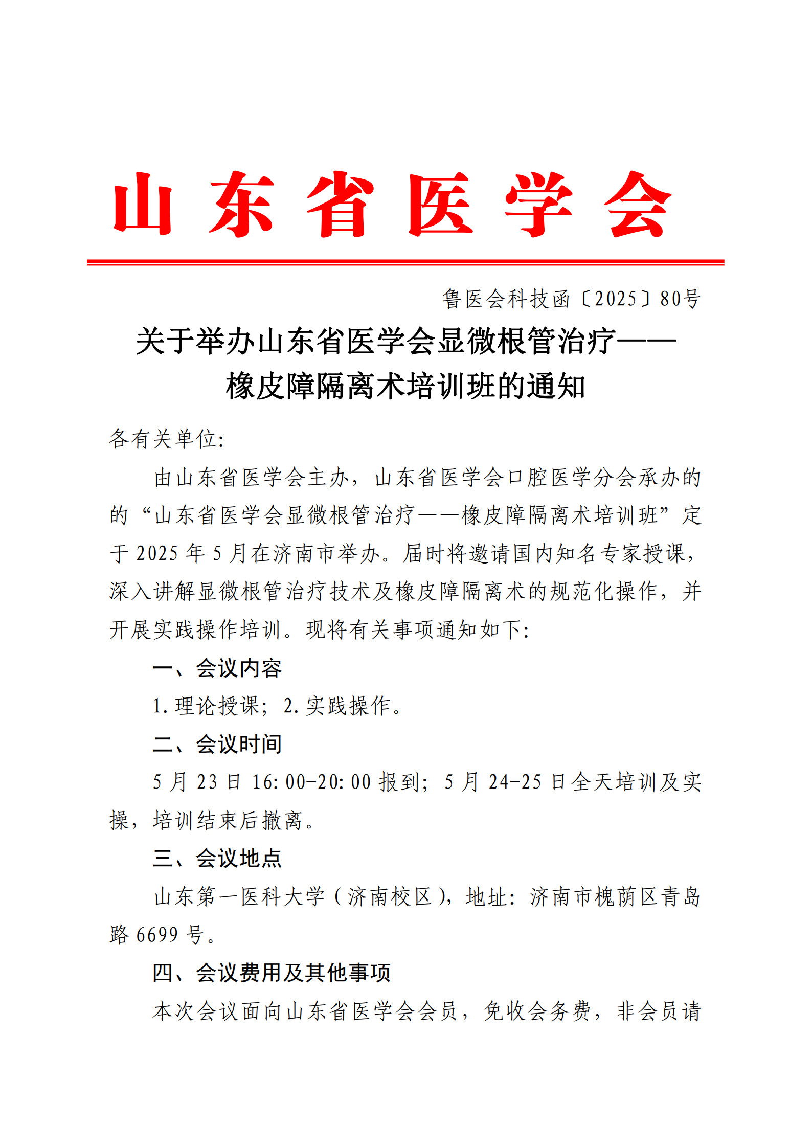 关于举办山东省医学会显微根管治疗——橡皮障隔离术培训班的通知