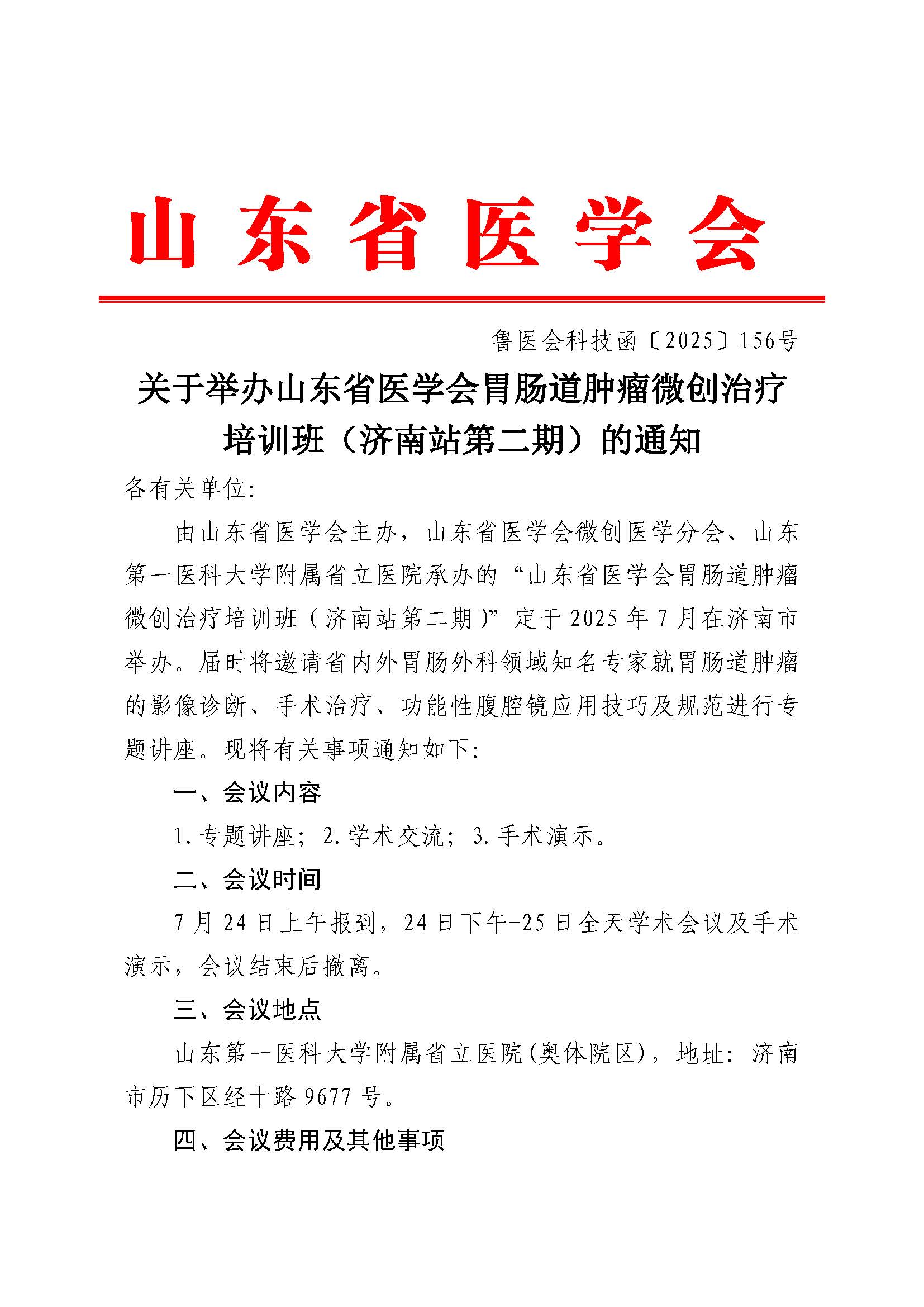 关于举办山东省医学会胃肠道肿瘤微创治疗培训班(济南站第二期)的通知