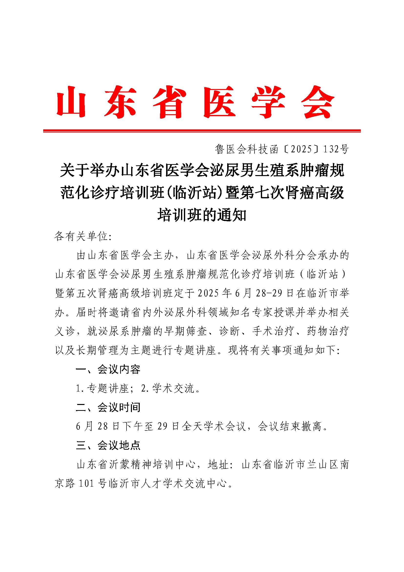 关于举办山东省医学会泌尿男生殖系肿瘤规范化诊疗培训班(临沂站)暨第七次肾癌高级培训班的通知