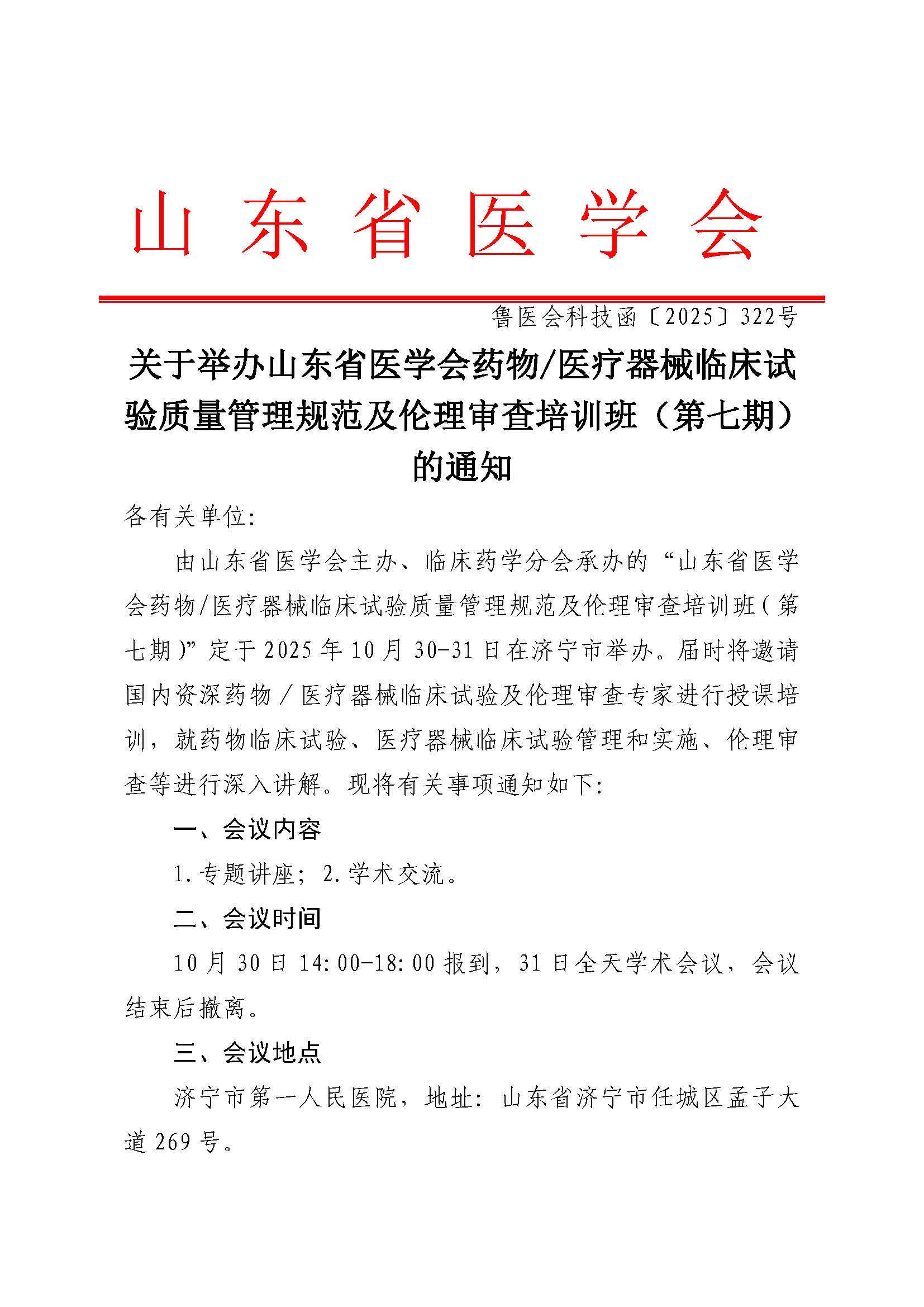 关于举办山东省医学会药物 医疗器械临床试验质量管理规范及伦理审查培训班(第七期)的通知