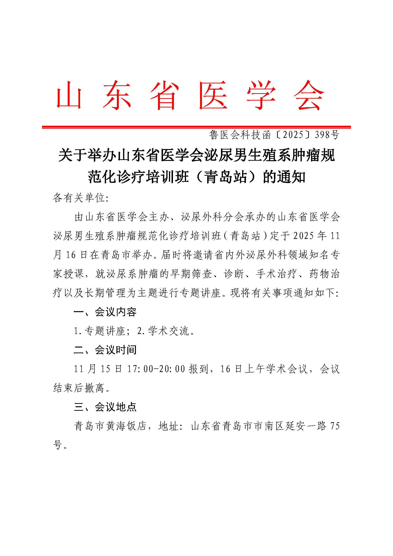 关于举办山东省医学会泌尿男生殖系肿瘤规范化诊疗培训班(青岛站)的通知