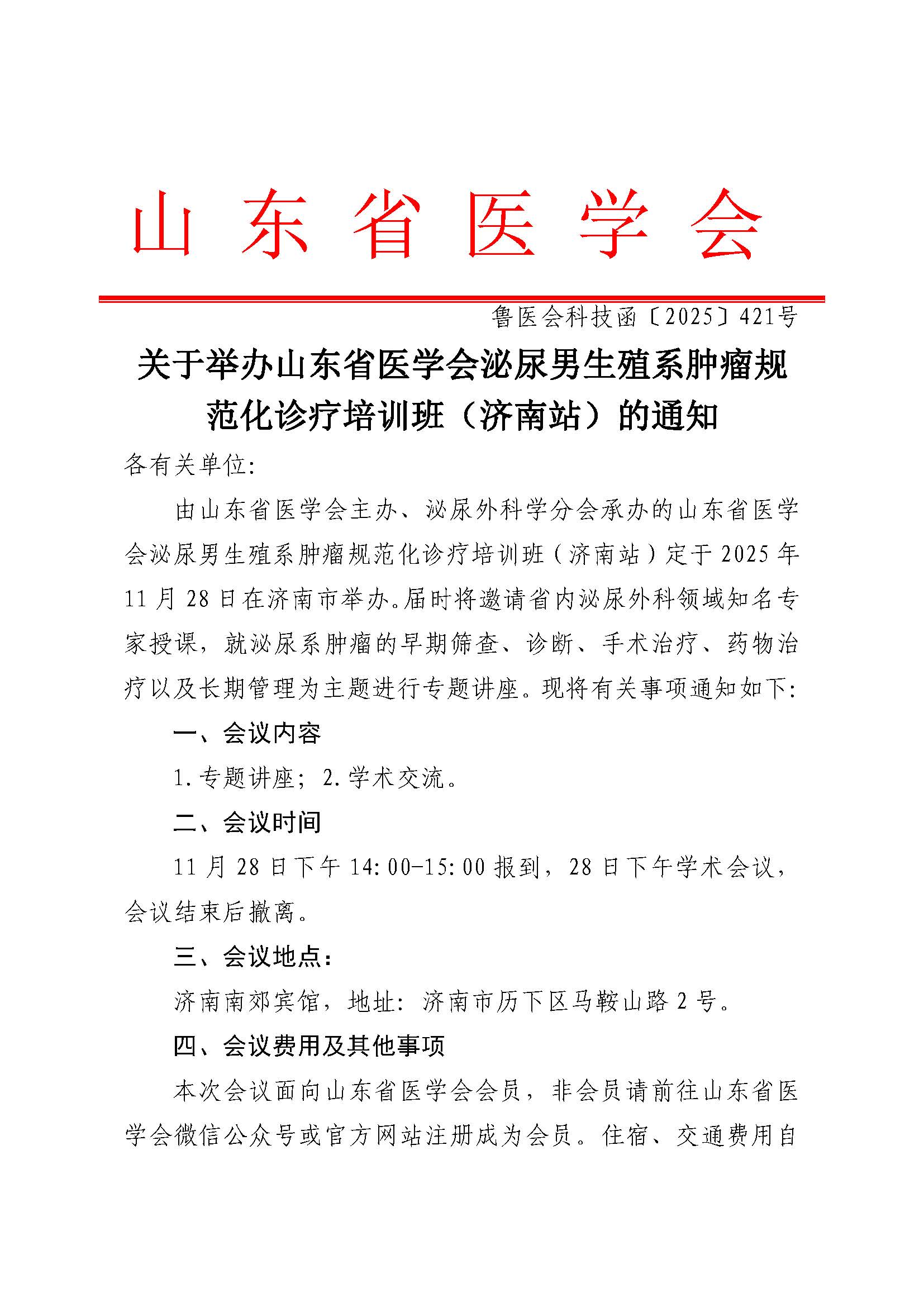 关于举办山东省医学会泌尿男生殖系肿瘤规范化诊疗培训班(济南站)的通知