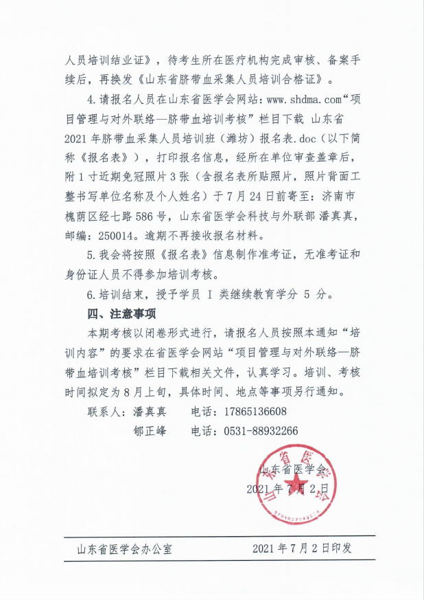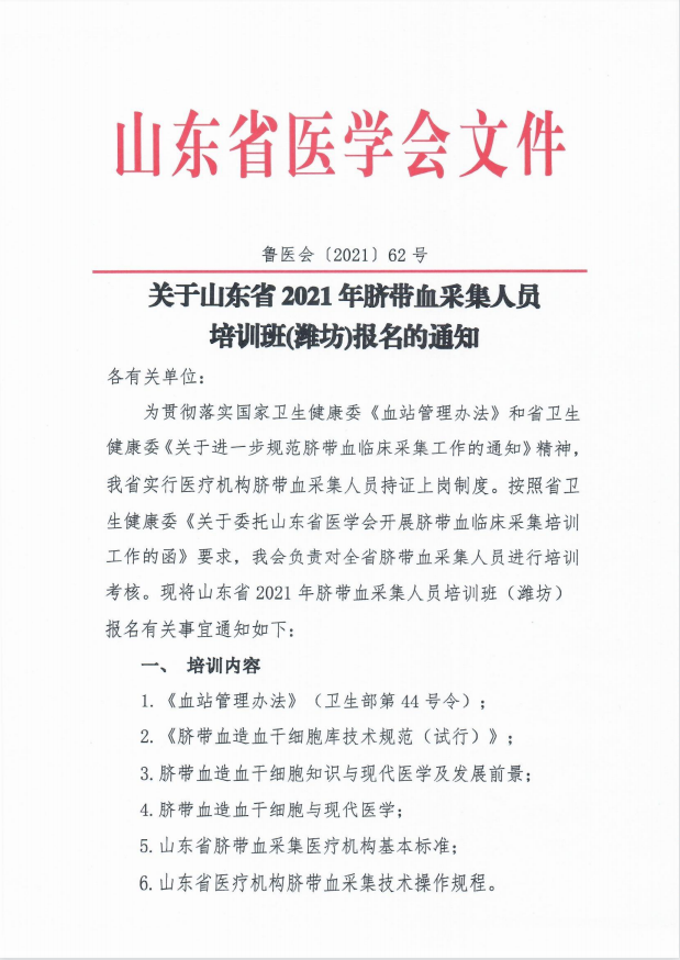 关于山东省2021年脐带血采集人员培训班(潍坊)报名的通知