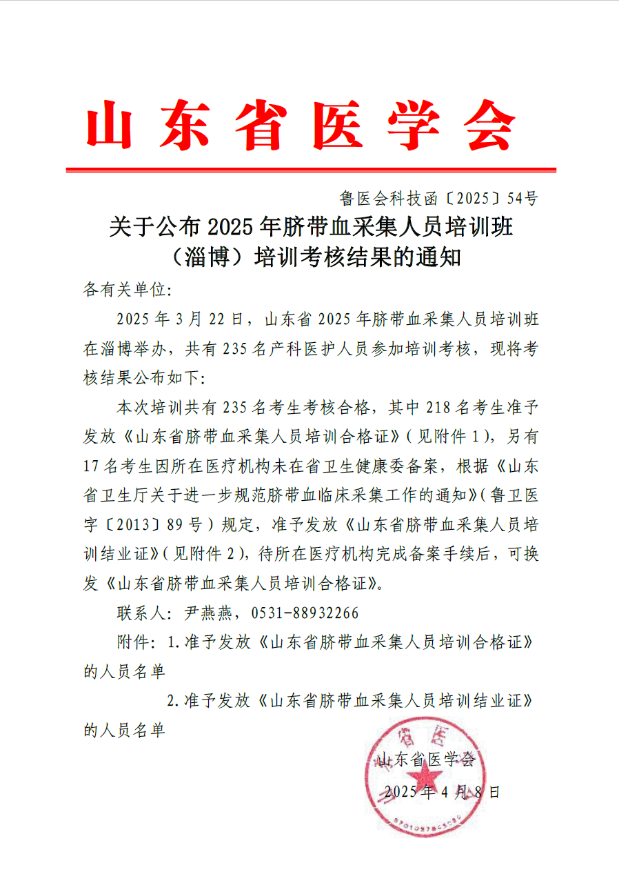 关于公布2025年脐带血采集人员培训班(淄博)培训考核结果的通知