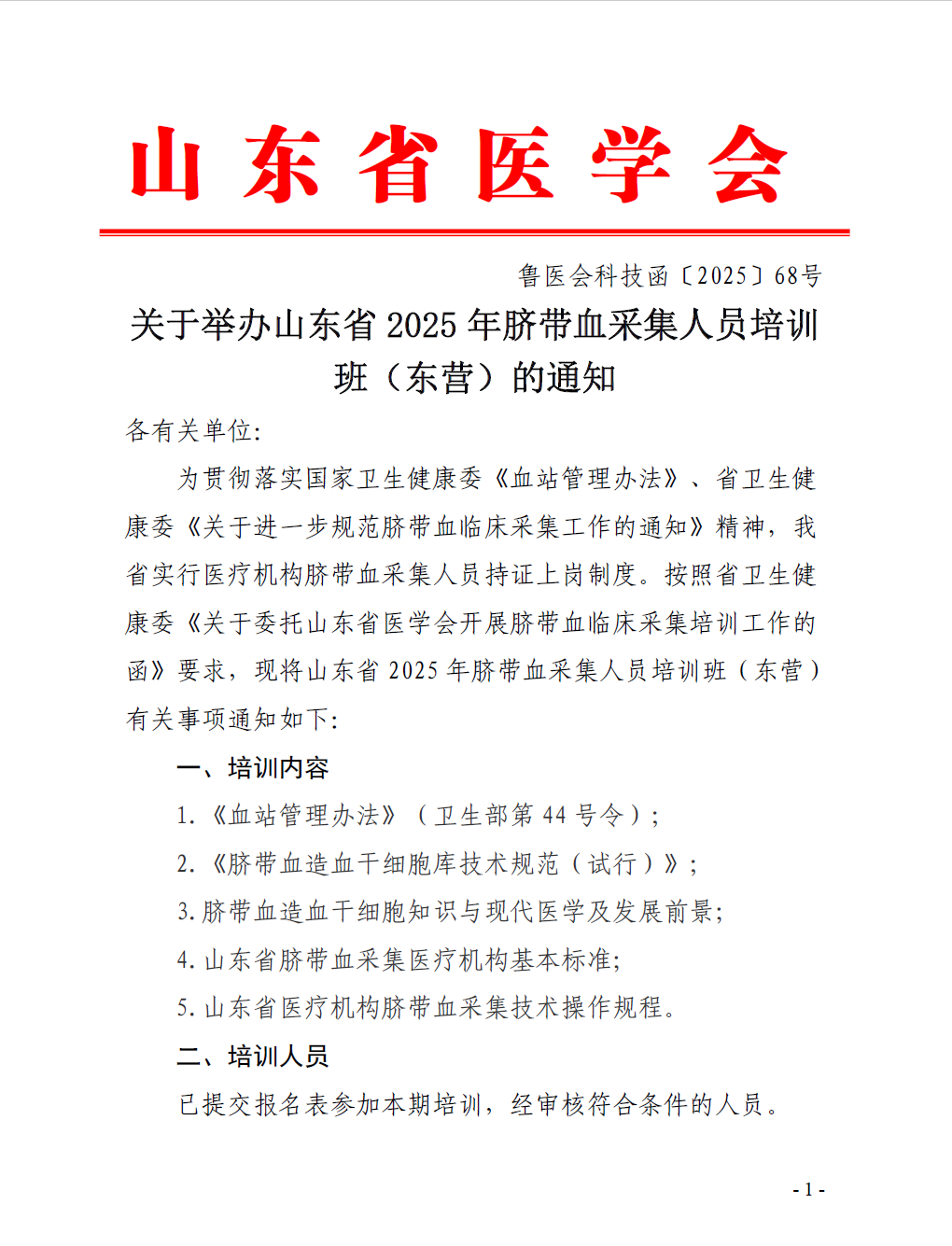 关于举办山东省2025年脐带血采集人员培训班(东营)的通知