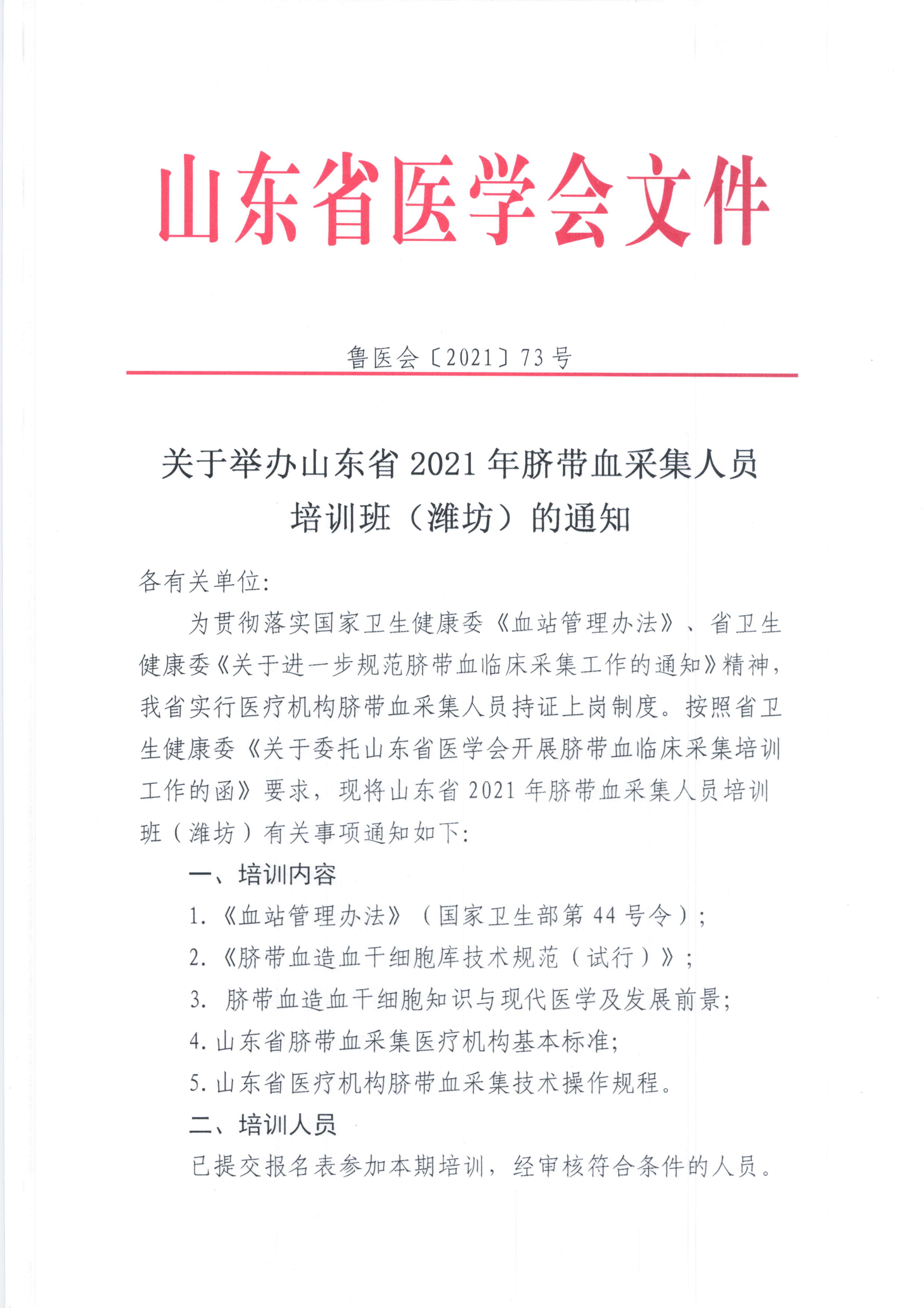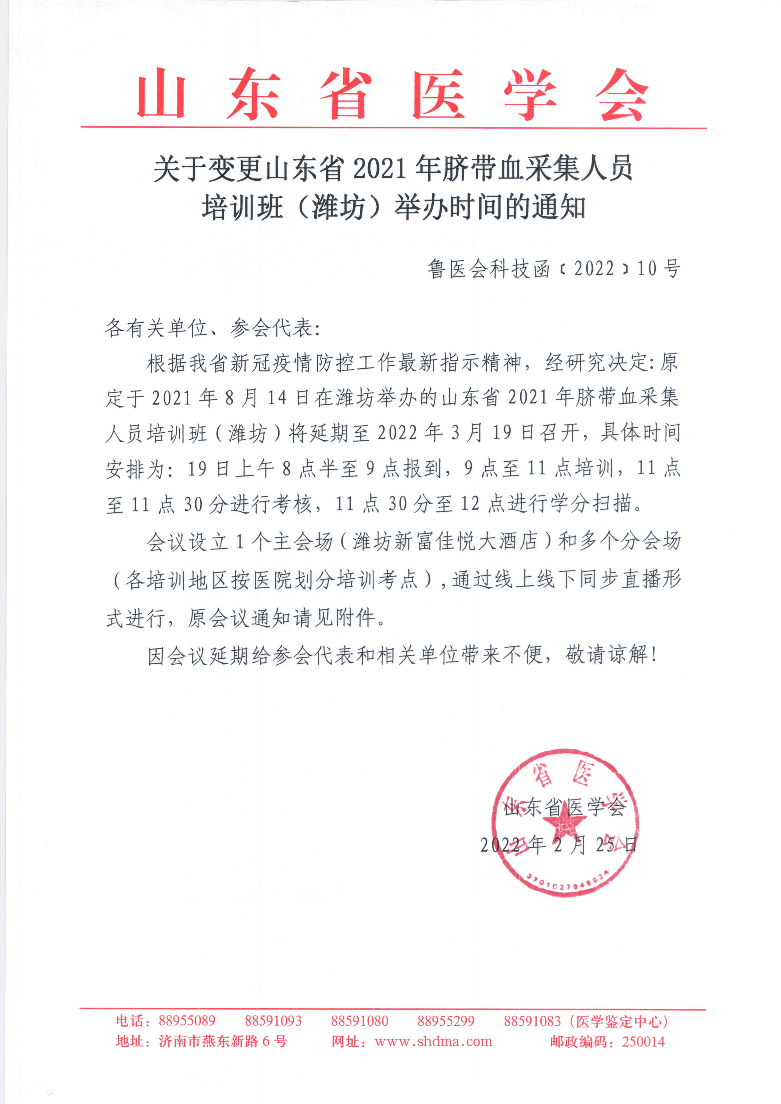 关于变更山东省2021年脐带血采集人员培训班(潍坊)举办时间的通知