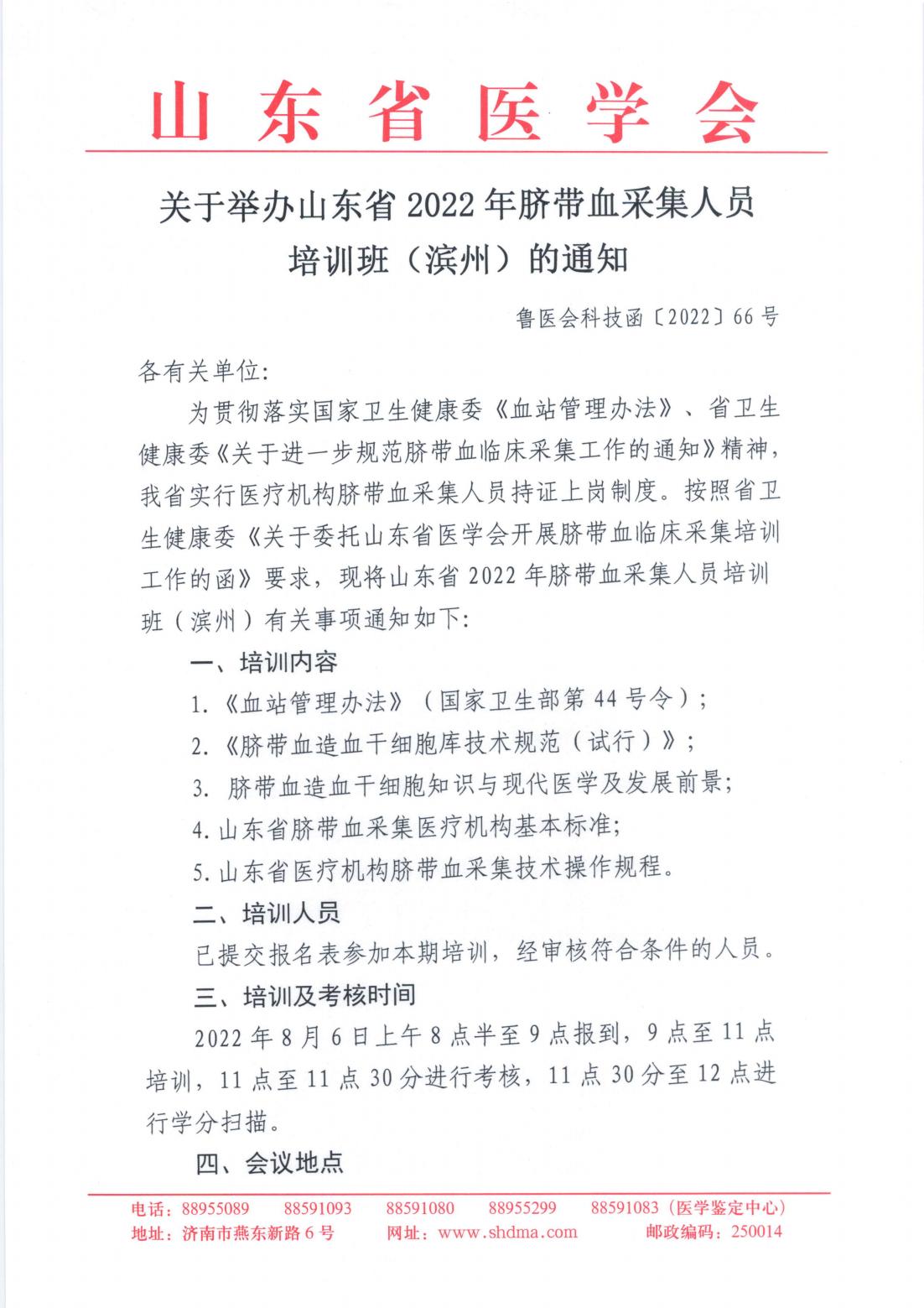 关于举办山东省2022年脐带血采集人员培训班(滨州)的通知