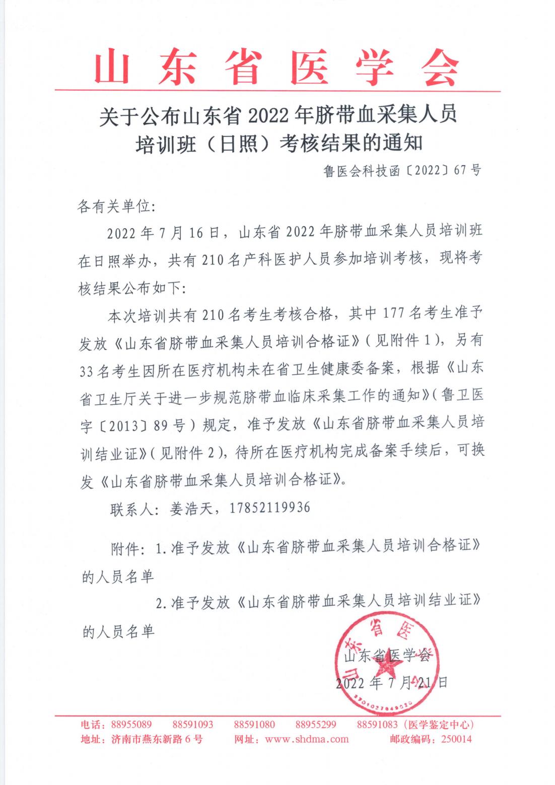 关于公布山东省2022年脐带血采集人员培训班(日照)考核结果的通知