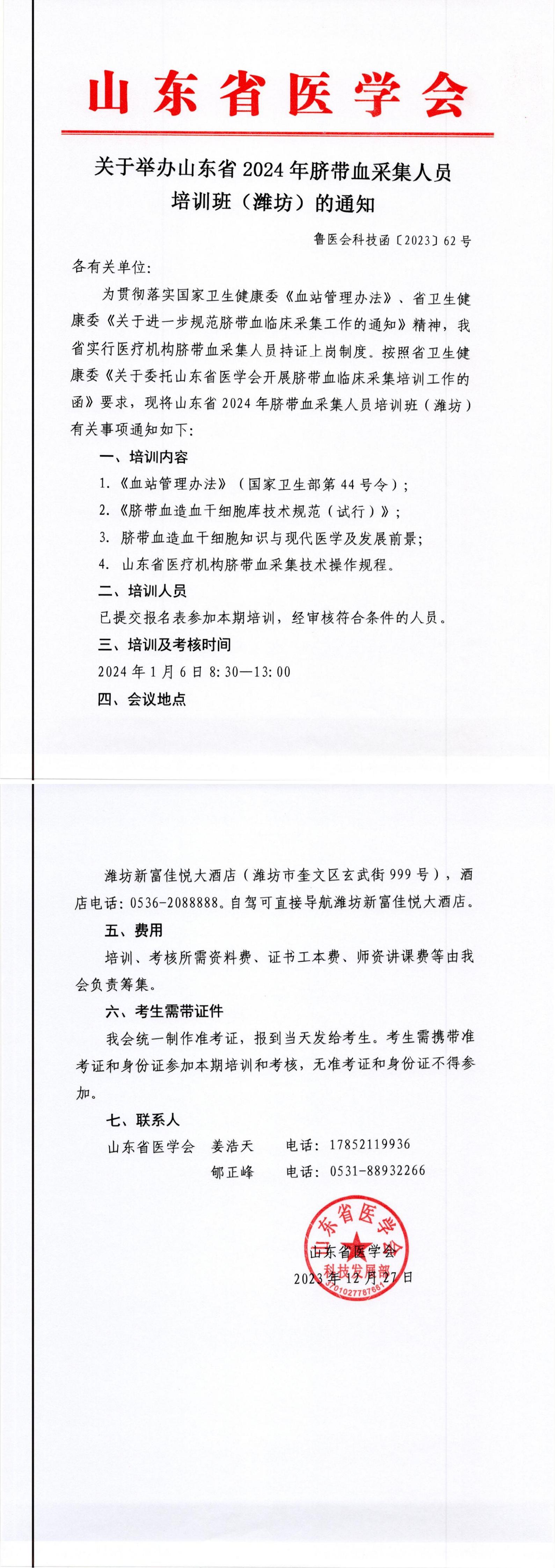 关于举办山东省2024年脐带血采集人员培训班(潍坊)的通知