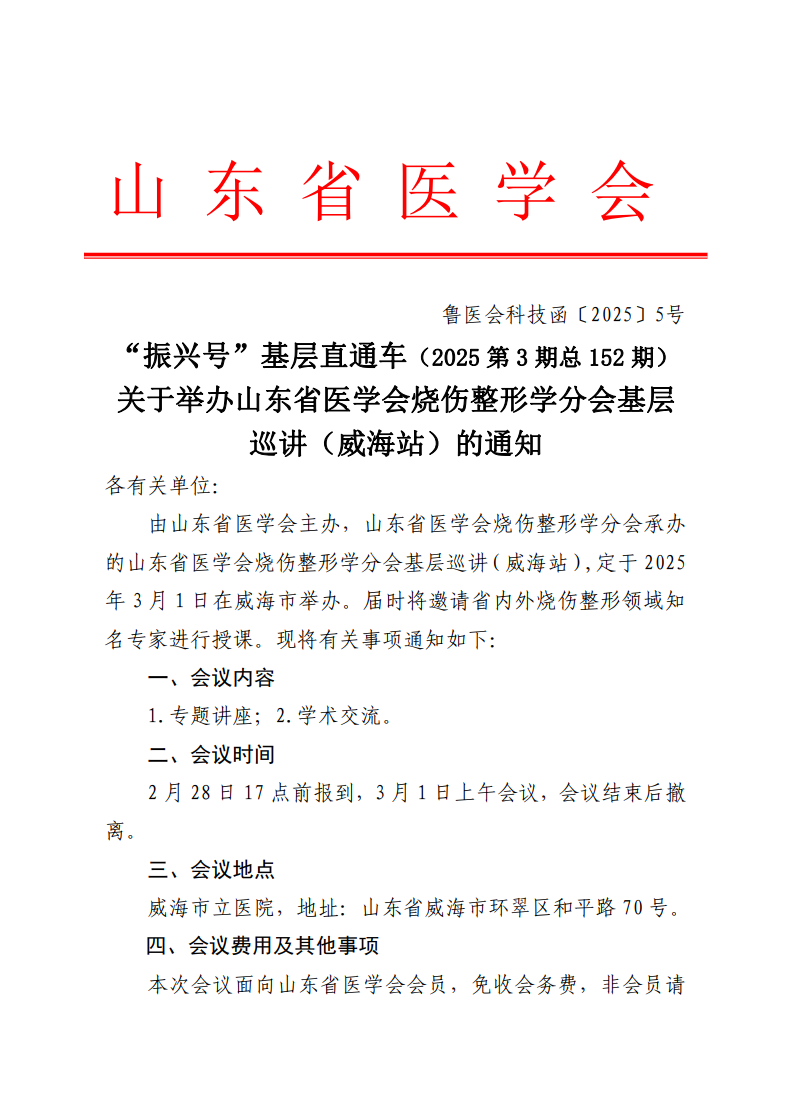 “振兴号”基层直通车(2025第3期总152期)关于举办山东省医学会烧伤整形学分会基层巡讲(威海站)的通知)