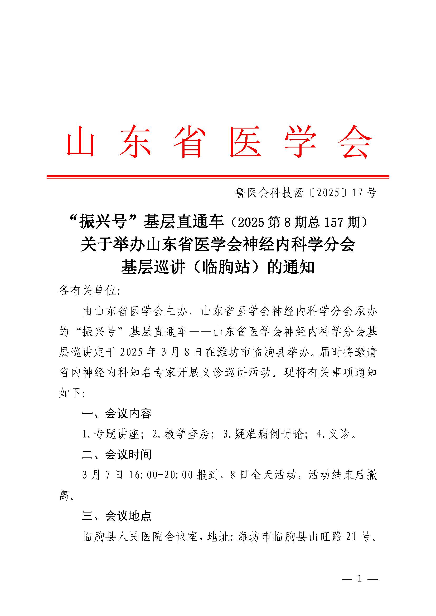 “振兴号”基层直通车(2025第8期总157期)关于举办山东省医学会神经内科学分会基层巡讲(临朐站)的通知