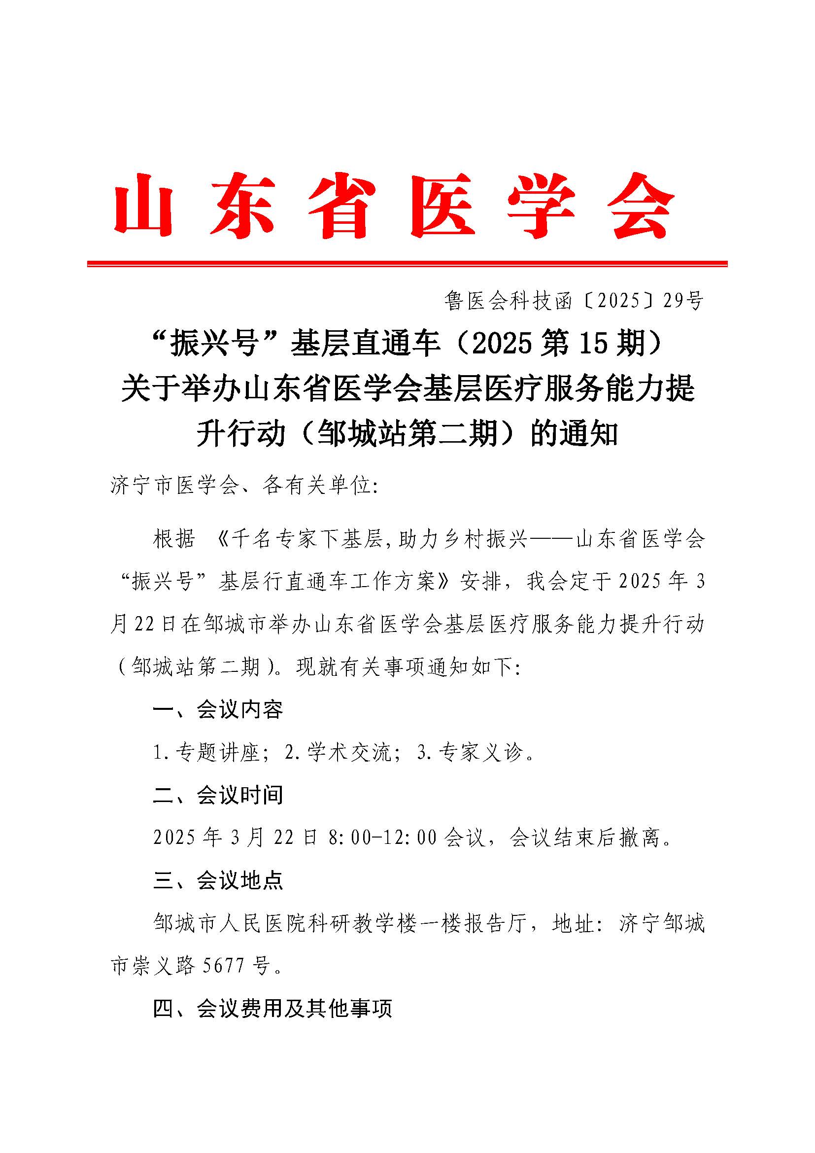 “振兴号”基层直通车(2025第15期)关于举办山东省医学会基层医疗服务能力提升行动(邹城站第二期)的通知