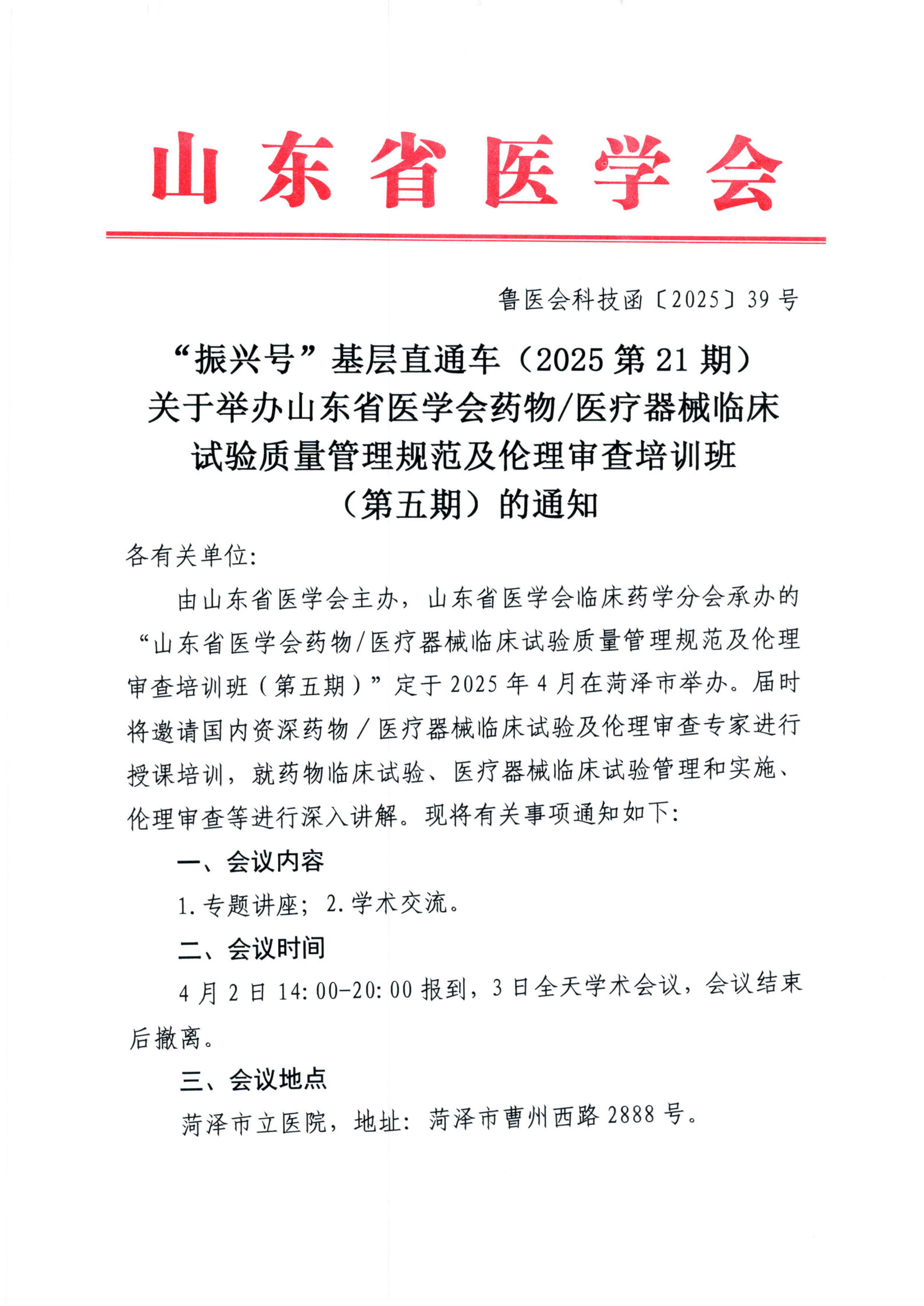 “振兴号”基层直通车(2025第21期)关于举办山东省医学会药物医疗器械临床试验质量管理规范及伦理审查培训班(第五期)的通知