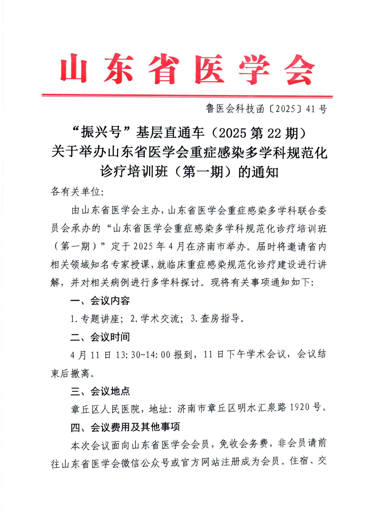 “振兴号”基层直通车(2025第22期)关于举办山东省医学会重症感染多学科规范化诊疗培训班(第一期)的通知
