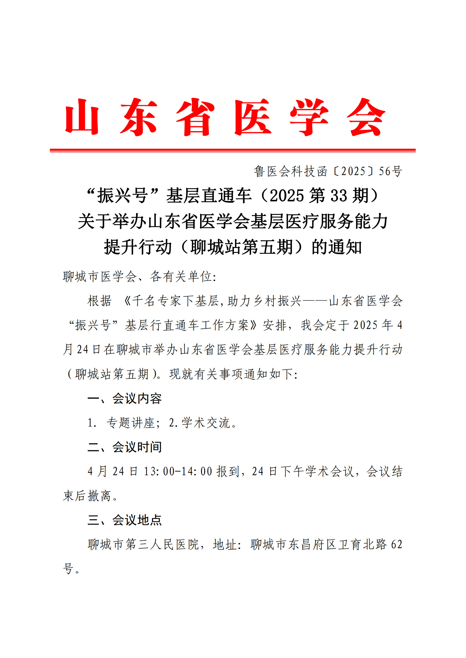 “振兴号”基层直通车(2025第33期)关于举办山东省医学会基层医疗服务能力提升行动(聊城站第五期)的通知