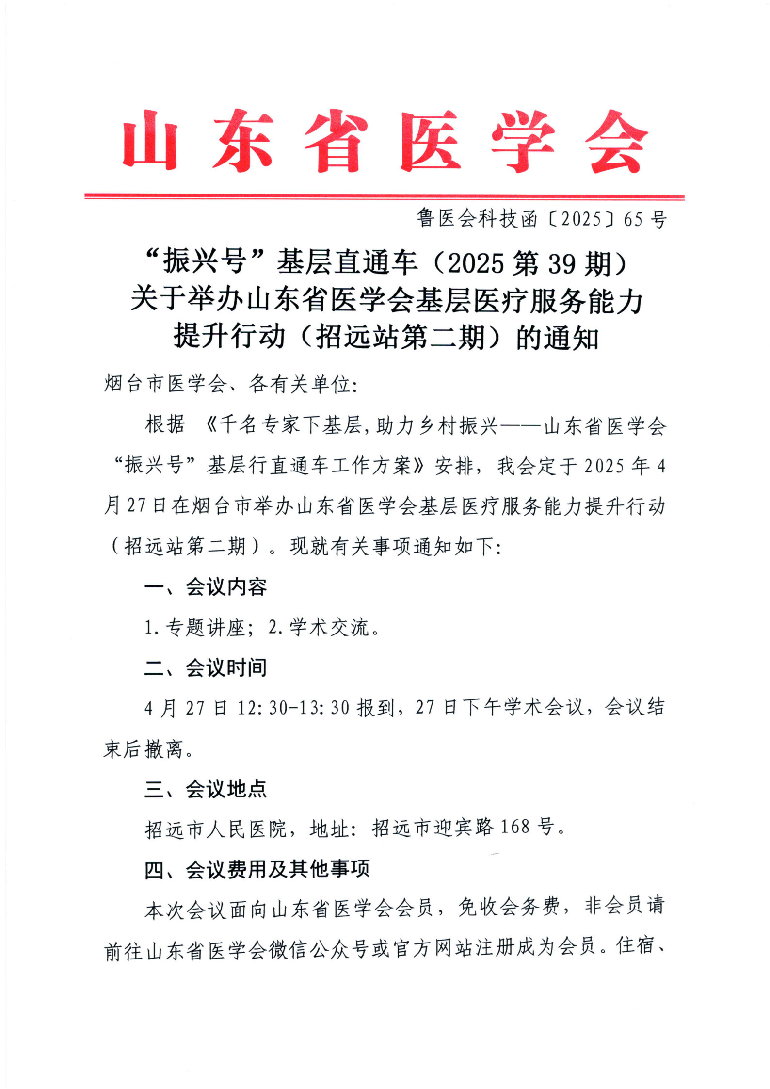 “振兴号”基层直通车(2025第39期)关于举办山东省医学会基层医疗服务能力提升行动(招远站第二期)的通知