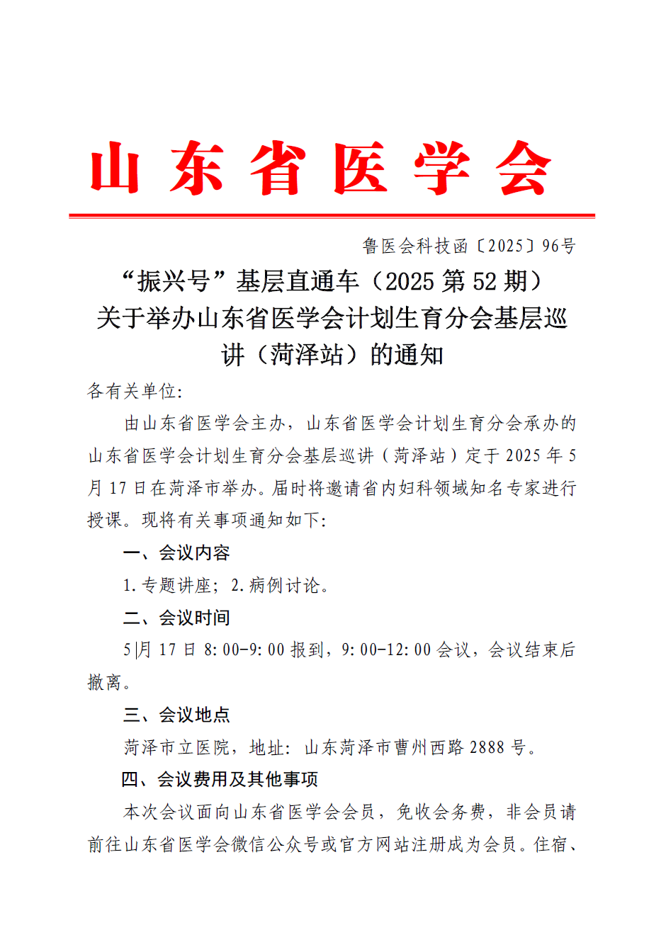 “振兴号”基层直通车(2025第52期)关于举办山东省医学会计划生育分会基层巡讲(菏泽站)的通知