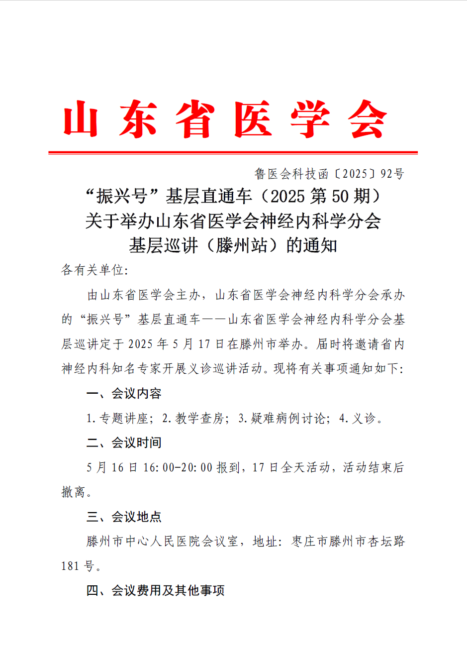 “振兴号”基层直通车(2025第50期)关于举办山东省医学会神经内科学分会基层巡讲(滕州站)的通知