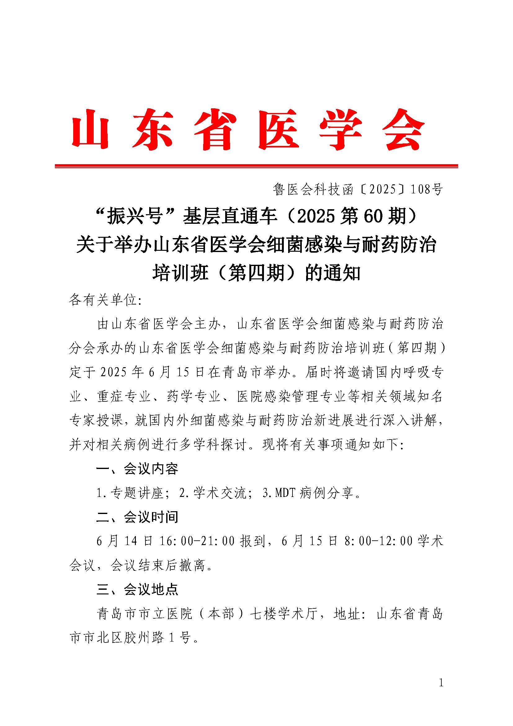 “振兴号”基层直通车(2025第60期)关于举办山东省医学会细菌感染与耐药防治培训班(第四期)的通知