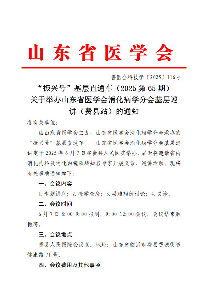 “振兴号”基层直通车(2025第65期)关于举办山东省医学会消化病学分会基层巡讲(费县站)的通知
