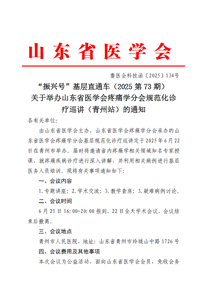 “振兴号”基层直通车(2025第73期)关于举办山东省医学会疼痛学分会规范化诊疗巡讲(青州站)的通知