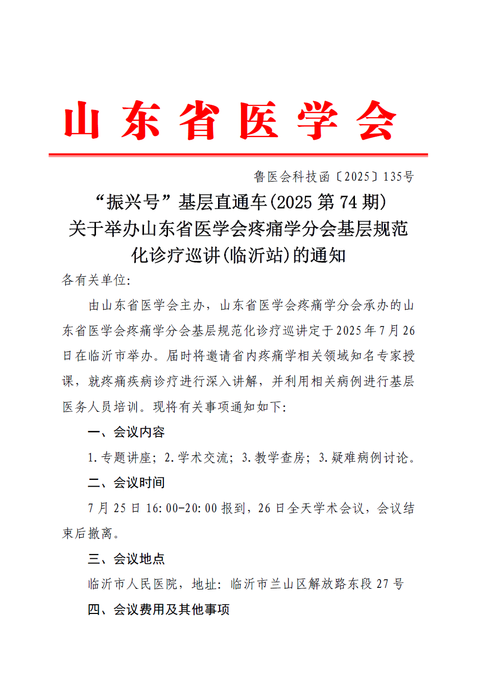 “振兴号”基层直通车(2025第74期)关于举办山东省医学会疼痛学分会基层规范化诊疗巡讲(临沂站)的通知
