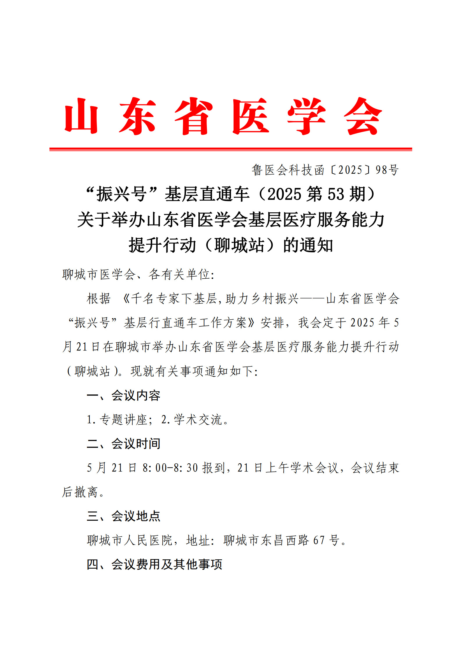 “振兴号”基层直通车(2025第53期)关于举办山东省医学会基层医疗服务能力提升行动(聊城站)的通知