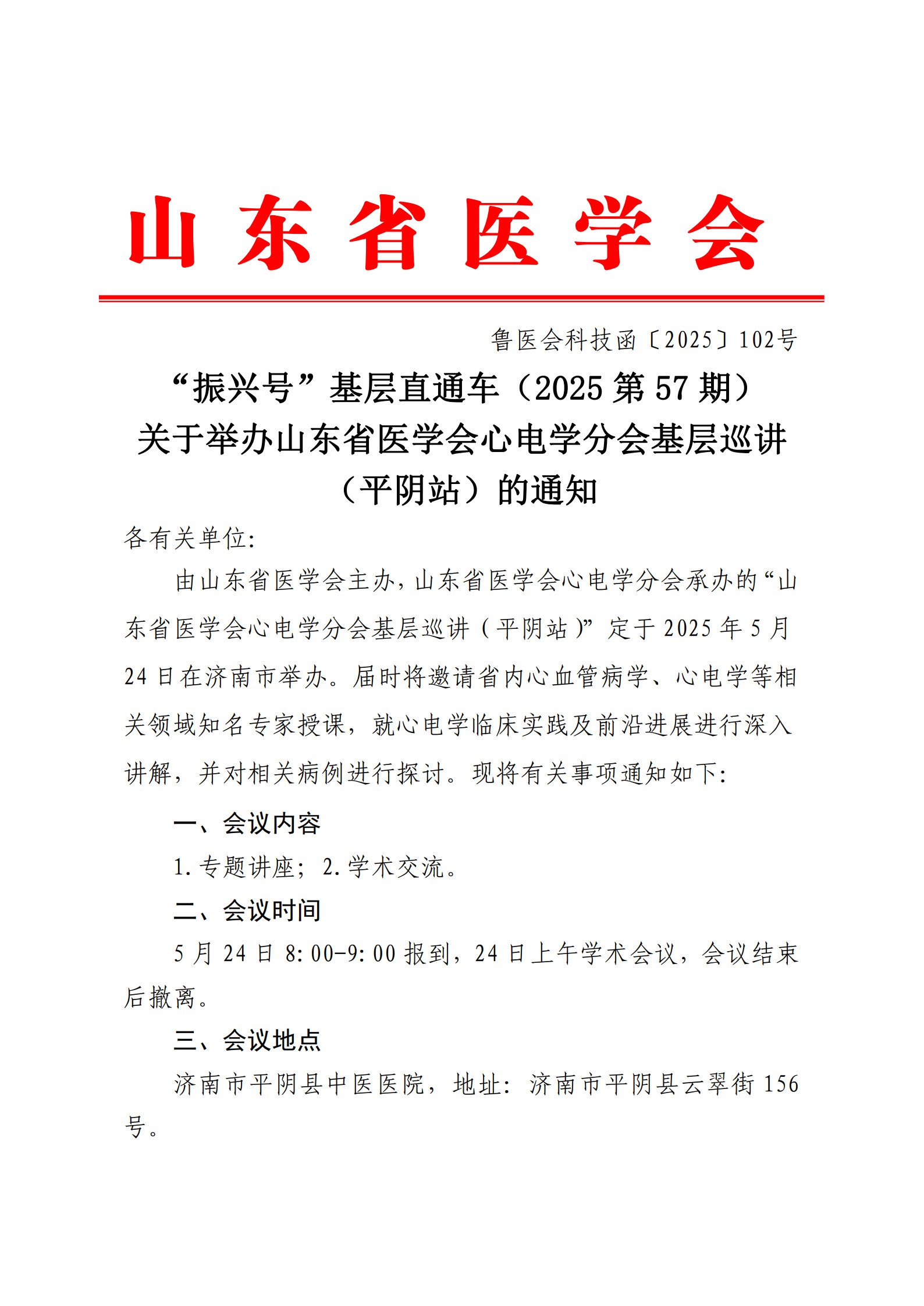 “振兴号”基层直通车(2025第57期)关于举办山东省医学会心电学分会基层巡讲(平阴站)的通知