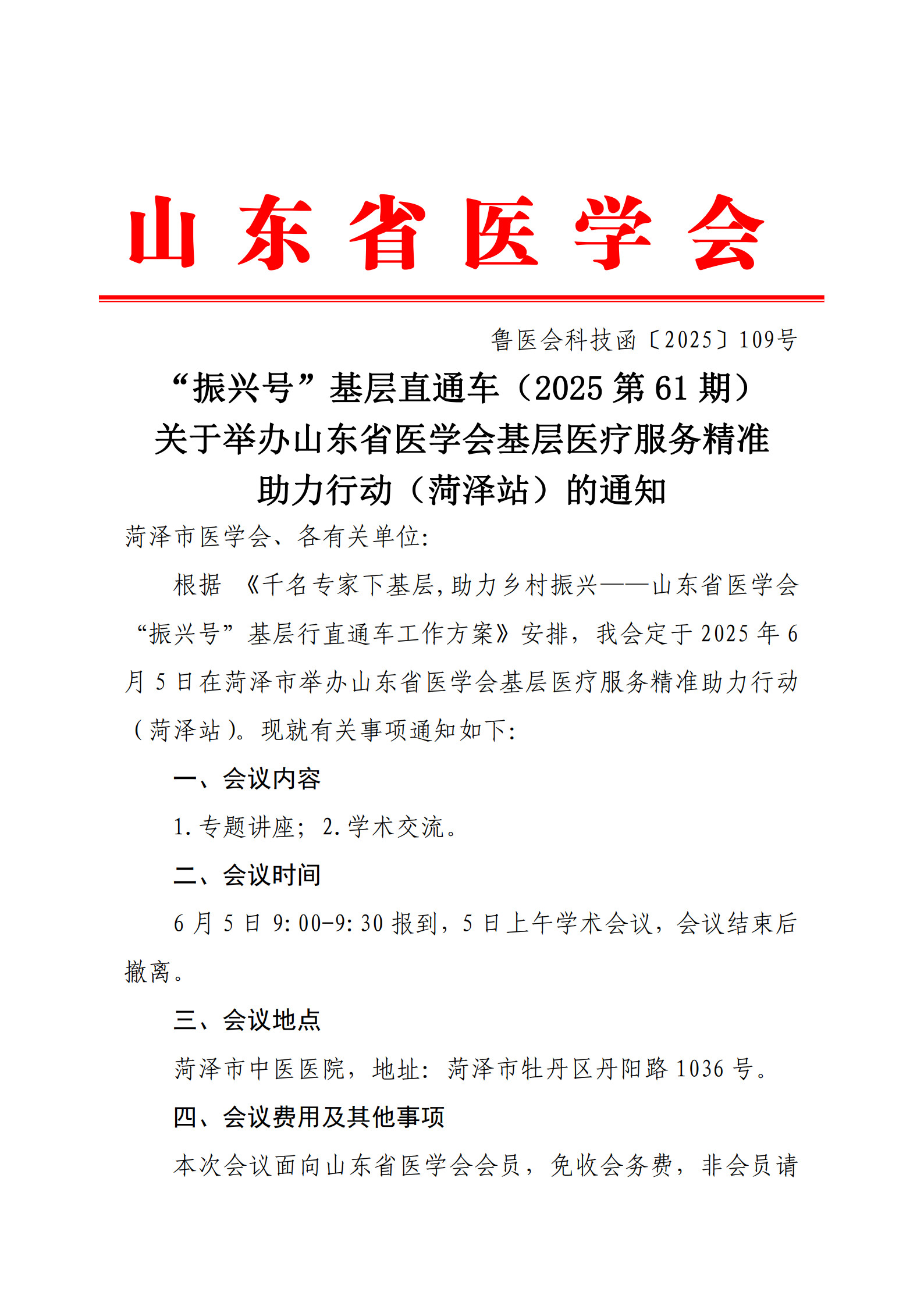 “振兴号”基层直通车(2025第61期)关于举办山东省医学会基层医疗服务精准助力行动(菏泽站)的通知