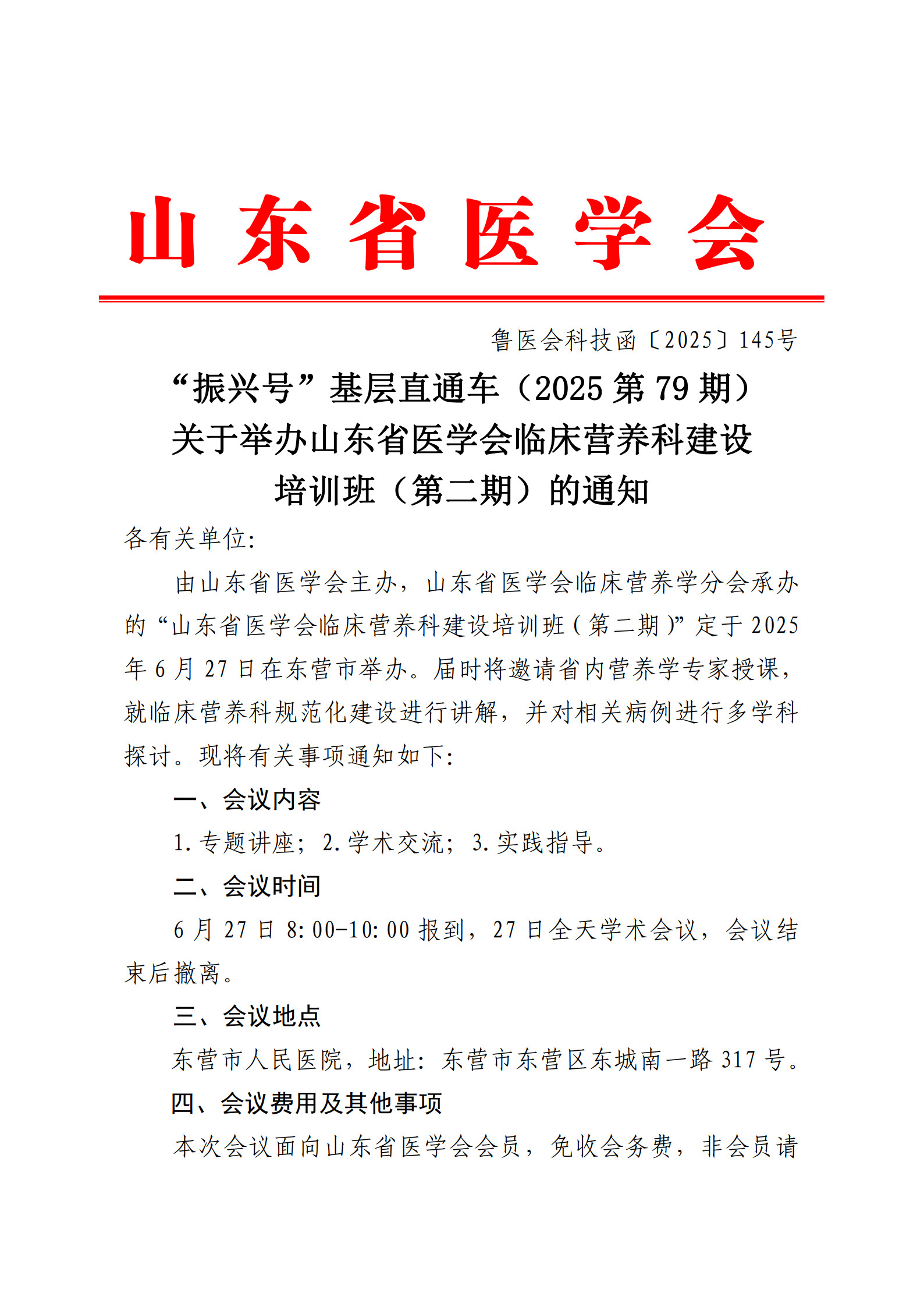 “振兴号”基层直通车(2025第79期)关于举办山东省医学会临床营养科建设培训班(第二期)的通知