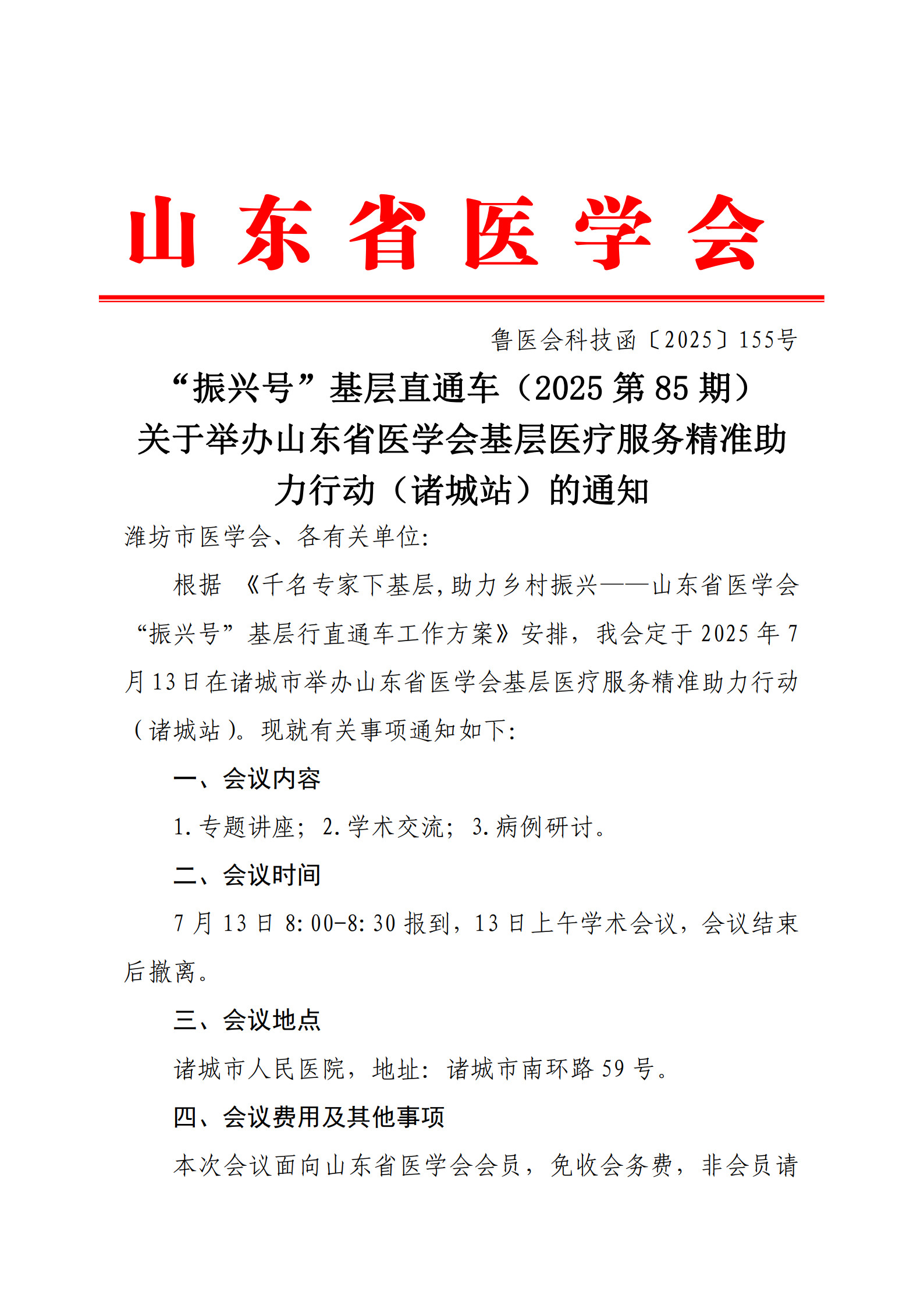 “振兴号”基层直通车(2025第85期)关于举办山东省医学会基层医疗服务精准助力行动(诸城站)的通知