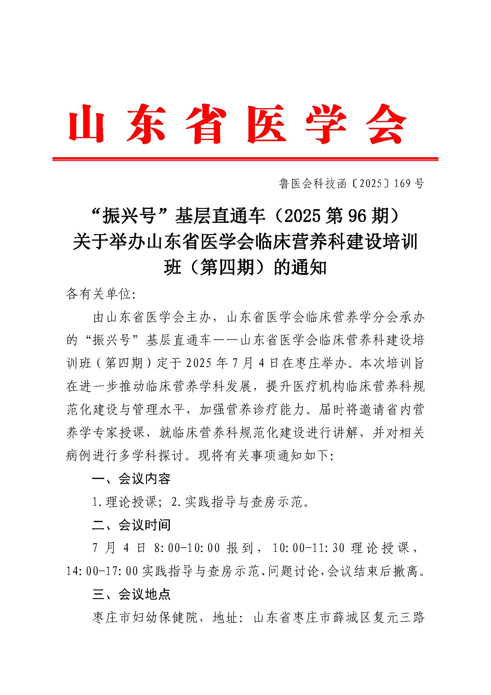 “振兴号”基层直通车(2025第96期)关于举办山东省医学会临床营养科建设培训班(第四期)的通知