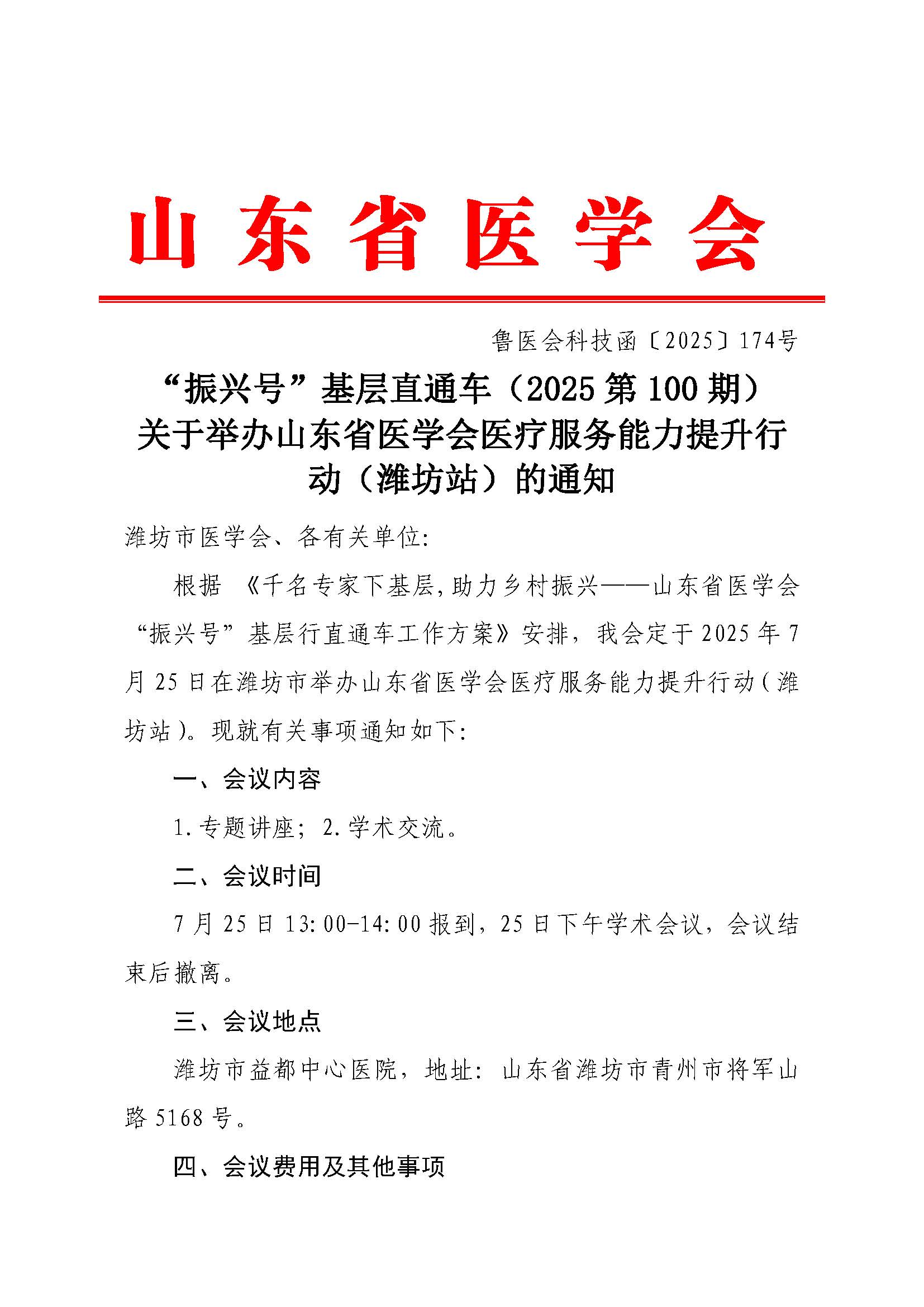 “振兴号”基层直通车(2025第100期)关于举办山东省医学会医疗服务能力提升行动(潍坊站)的通知