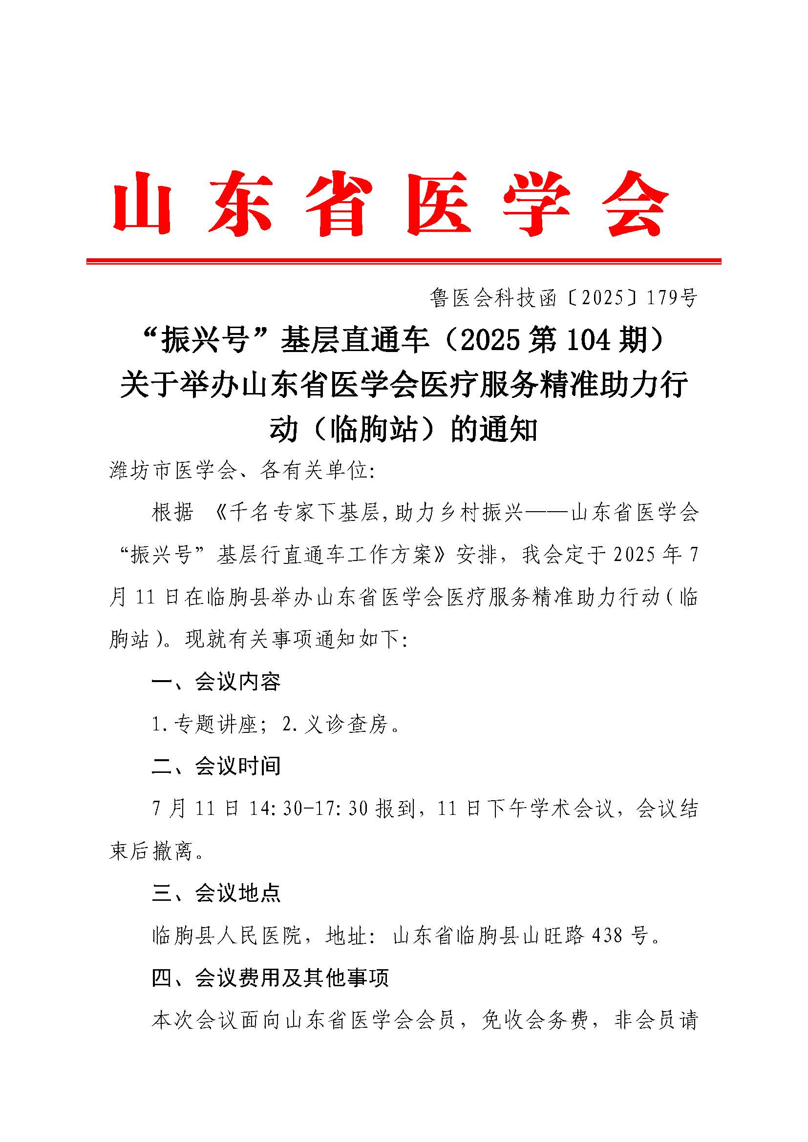 “振兴号”基层直通车(2025第104期)关于举办山东省医学会医疗服务精准助力行动(临朐站)的通知