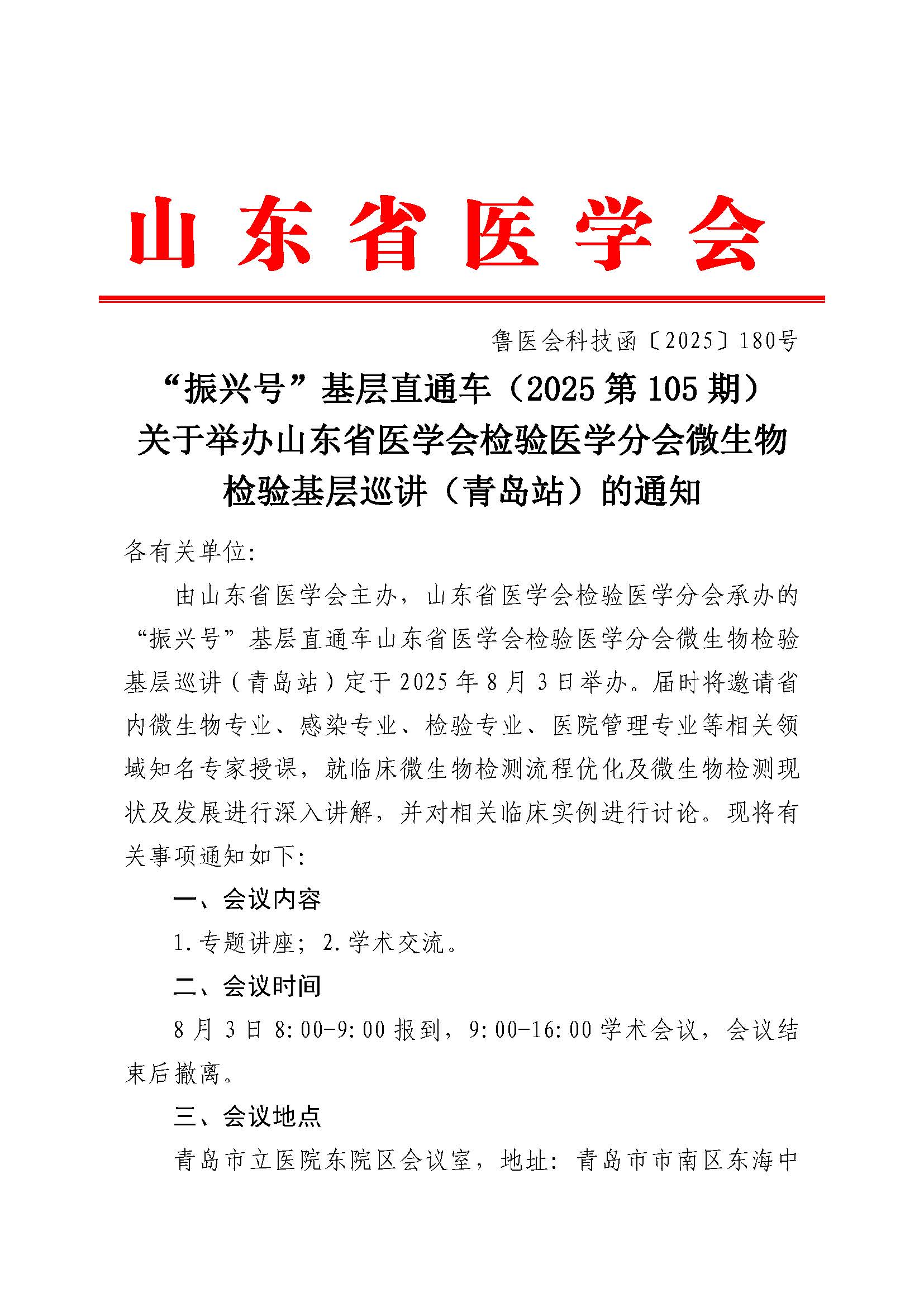 “振兴号”基层直通车(2025第105期)关于举办山东省医学会检验医学分会微生物检验基层巡讲(青岛站)的通知
