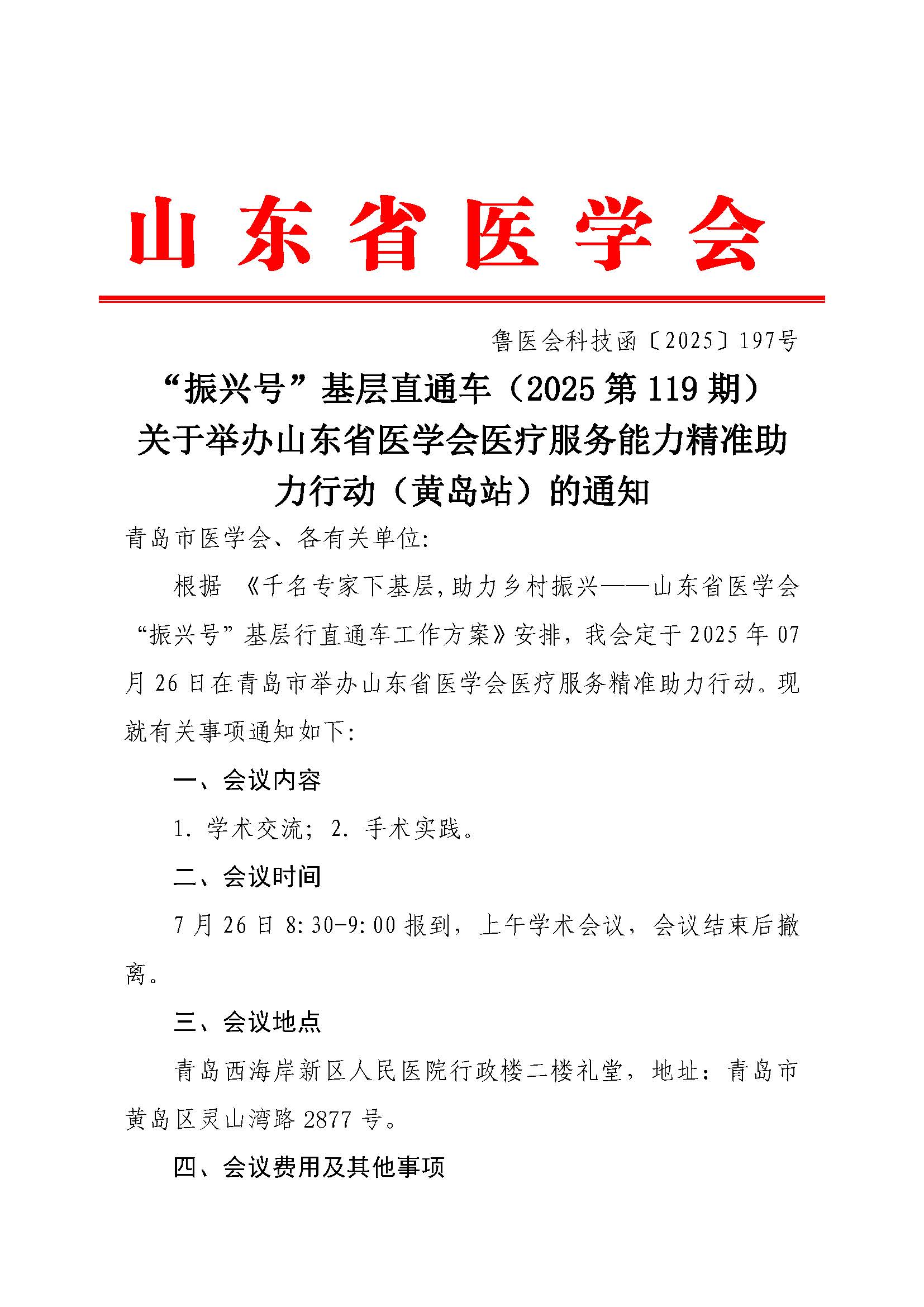 “振兴号”基层直通车(2025第119期)关于举办山东省医学会医疗服务能力精准助力行动(黄岛站)的通知