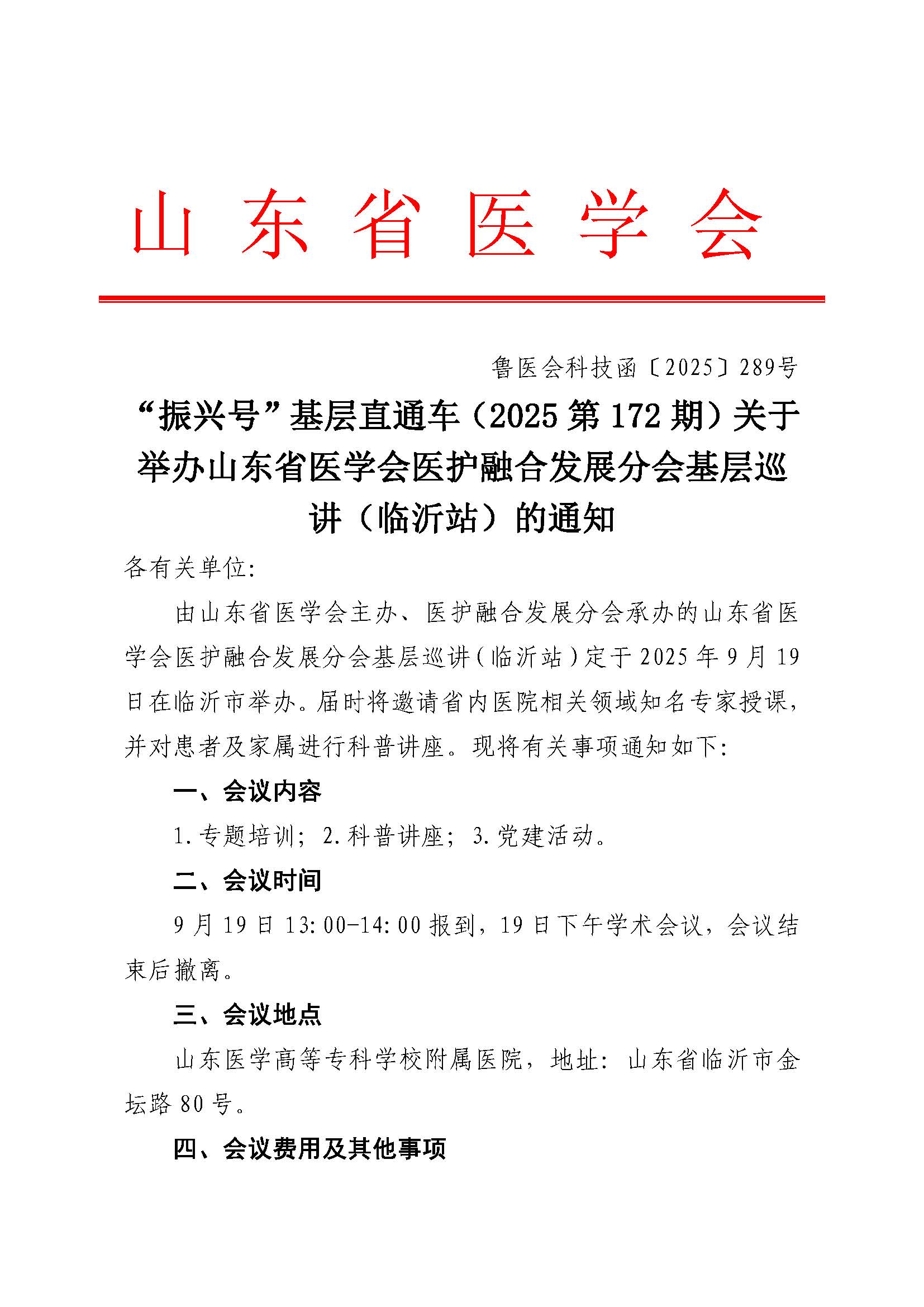 “振兴号”基层直通车(2025第172期)关于举办山东省医学会医护融合发展分会基层巡讲(临沂站)的通知
