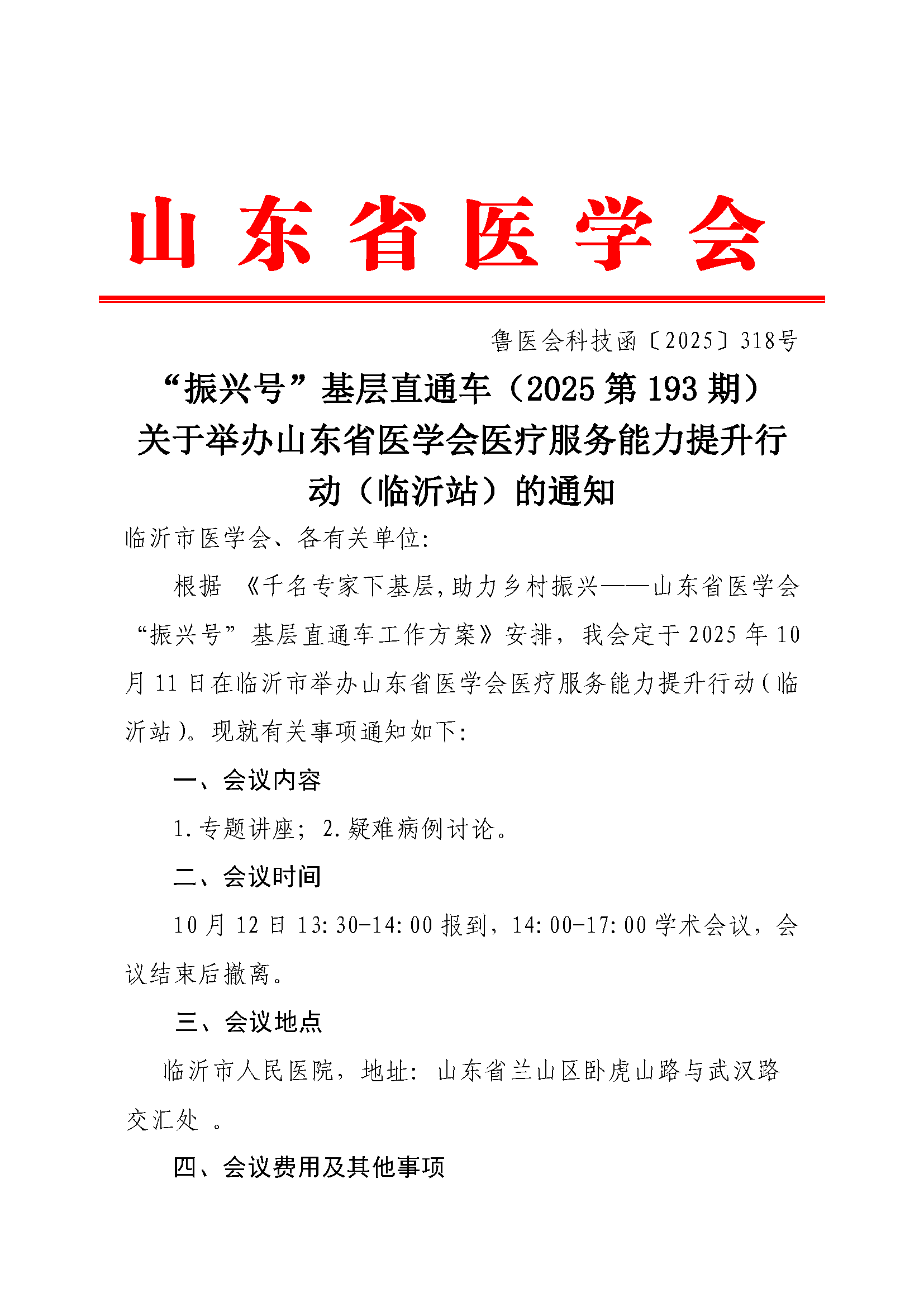 “振兴号”基层直通车(2025第193期)关于举办山东省医学会医疗服务能力提升行动(临沂站)的通知