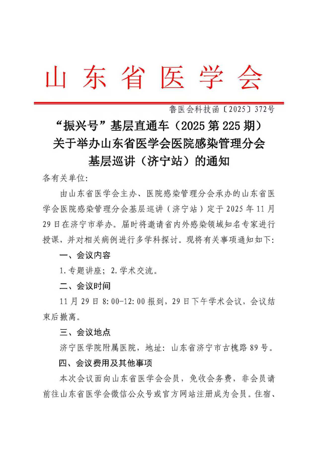 “振兴号”基层直通车(2025第225期)关于举办山东省医学会医院感染管理分会基层巡讲(济宁站)的通知