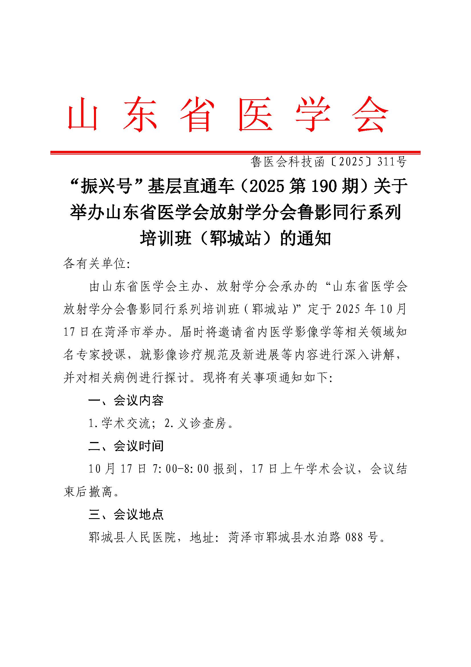 “振兴号”基层直通车(2025第190期)关于举办山东省医学会放射学分会鲁影同行系列培训班(郓城站)的通知