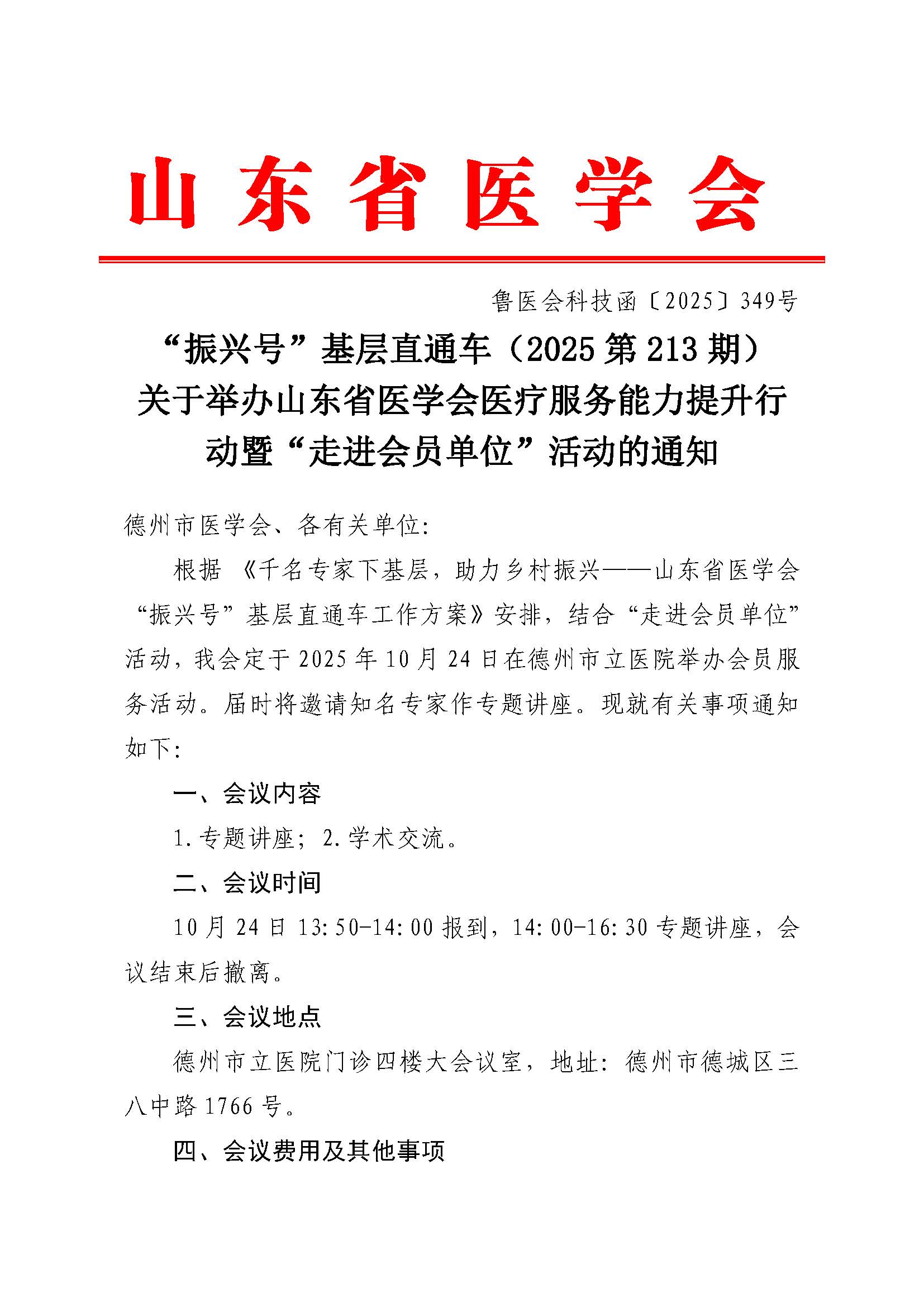 “振兴号”基层直通车(2025第213期)关于举办山东省医学会医疗服务能力提升行动暨“走进会员单位”活动的通知