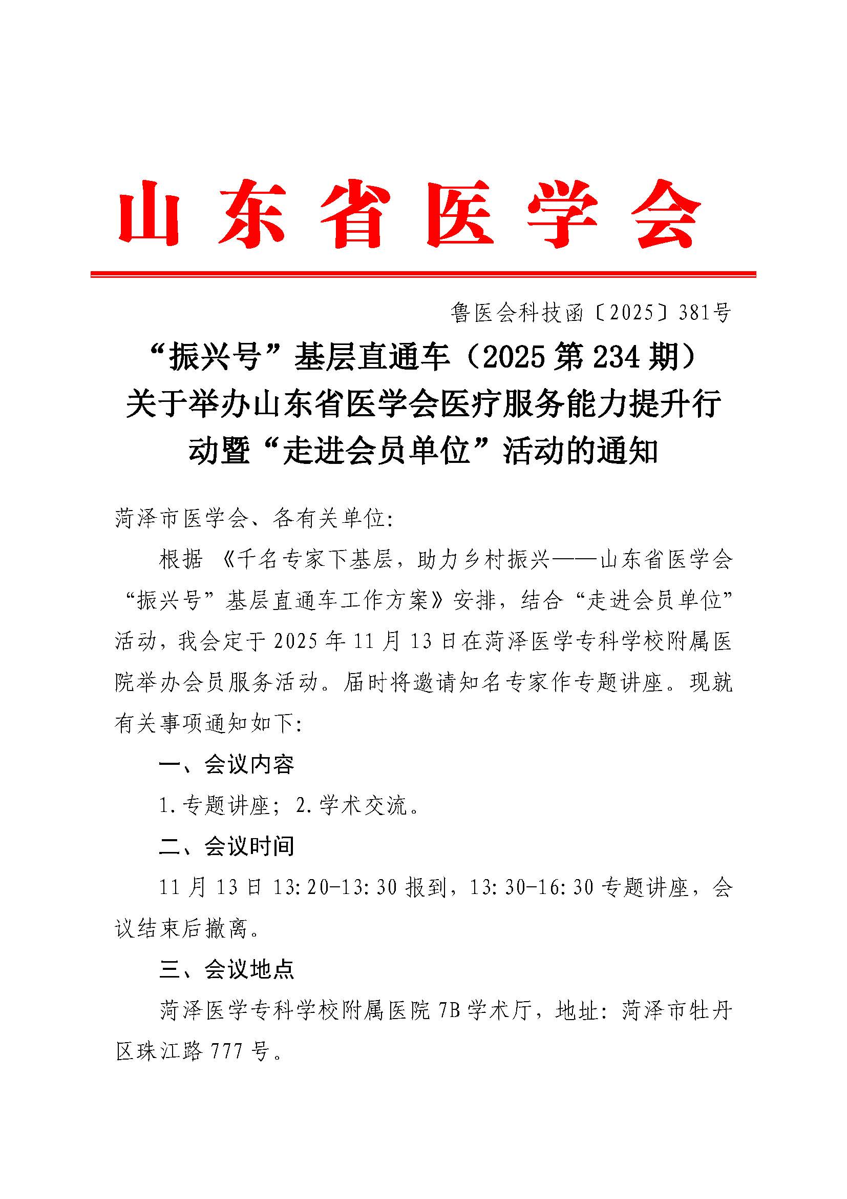 “振兴号”基层直通车(2025第234期)关于举办山东省医学会医疗服务能力提升行动暨“走进会员单位”活动的通知