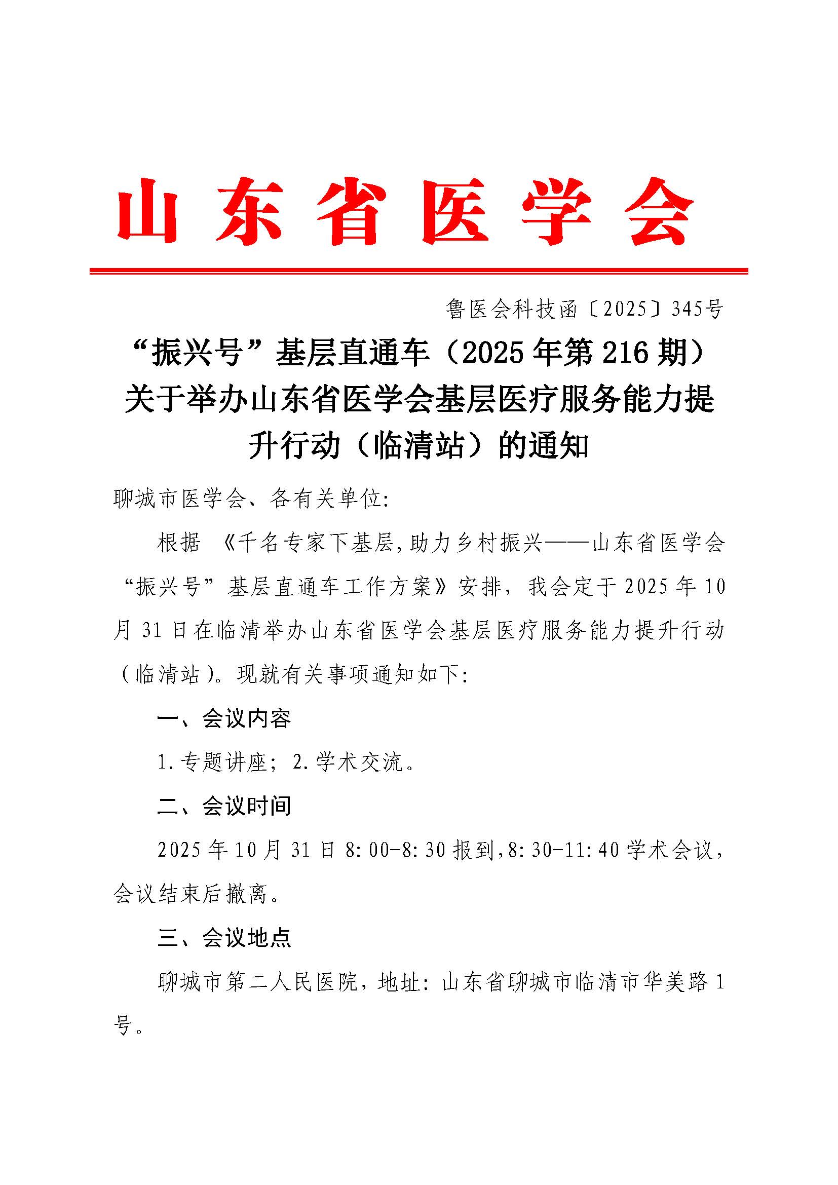 “振兴号”基层直通车(2025年第216期)关于举办山东省医学会基层医疗服务能力提升行动(临清站)的通知