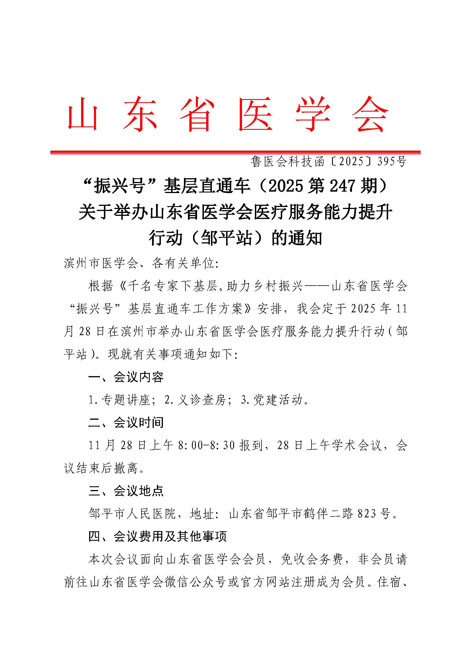 “振兴号”基层直通车(2025第247期)关于举办山东省医学会医疗服务能力提升行动(邹平站)的通知