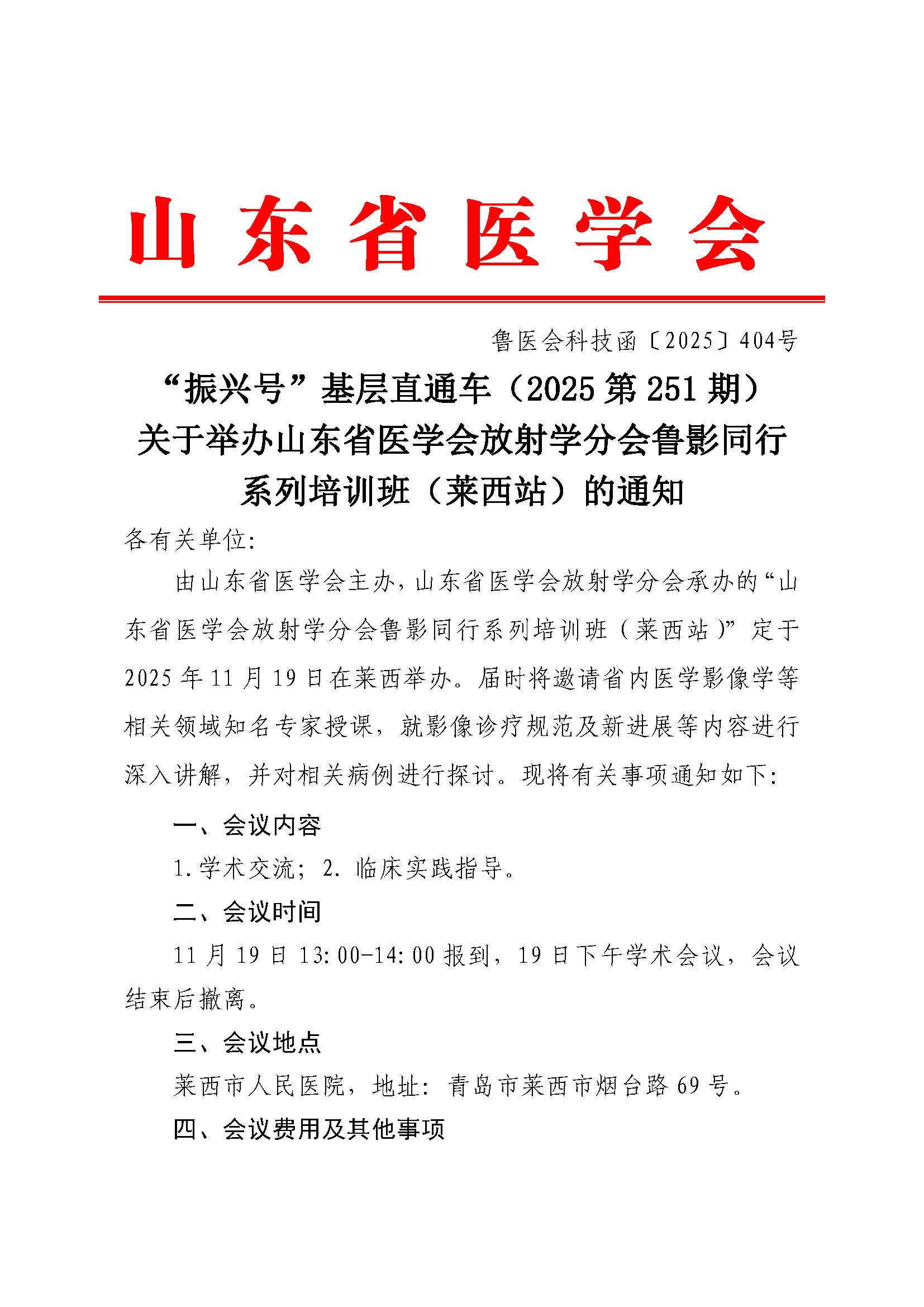 “振兴号”基层直通车(2025第251期)关于举办山东省医学会放射学分会鲁影同行系列培训班(莱西站)的通知