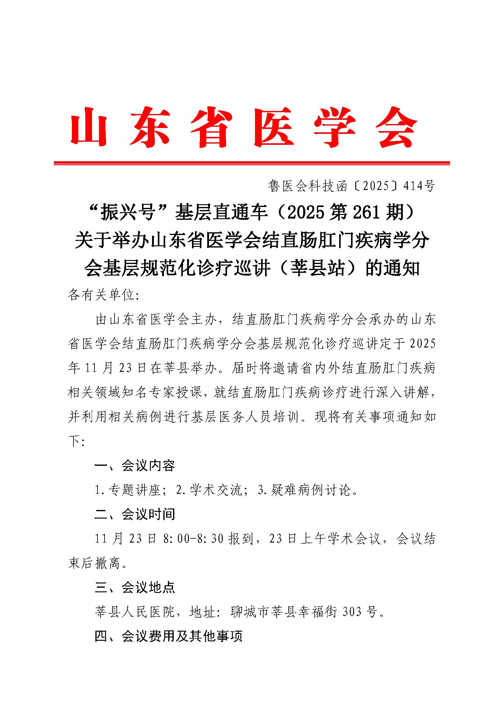 “振兴号”基层直通车(2025第261期)关于举办山东省医学会结直肠肛门疾病学分会基层规范化诊疗巡讲(莘县站)的通知