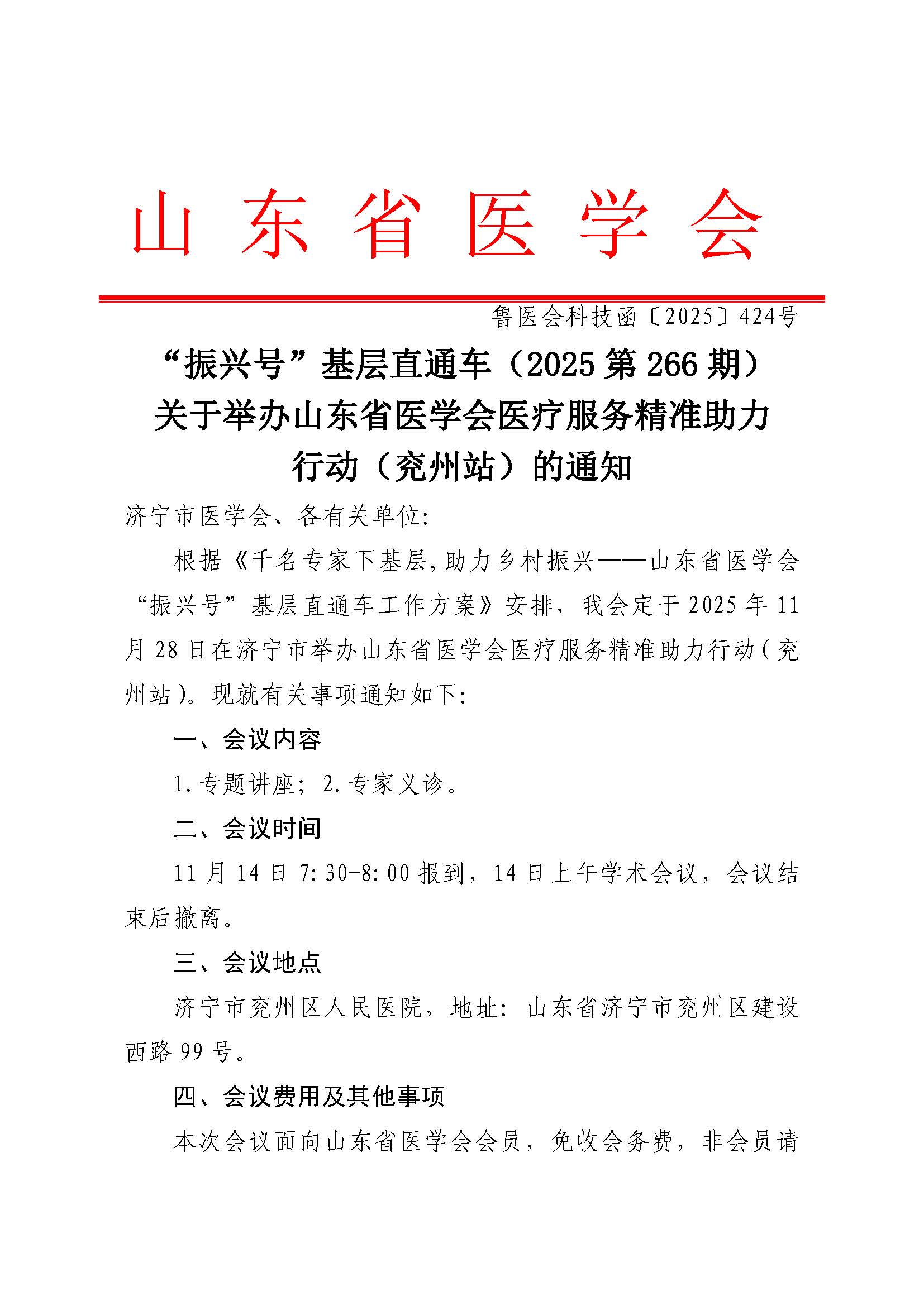 “振兴号”基层直通车(2025第266期)关于举办山东省医学会医疗服务精准助力行动(兖州站)的通知