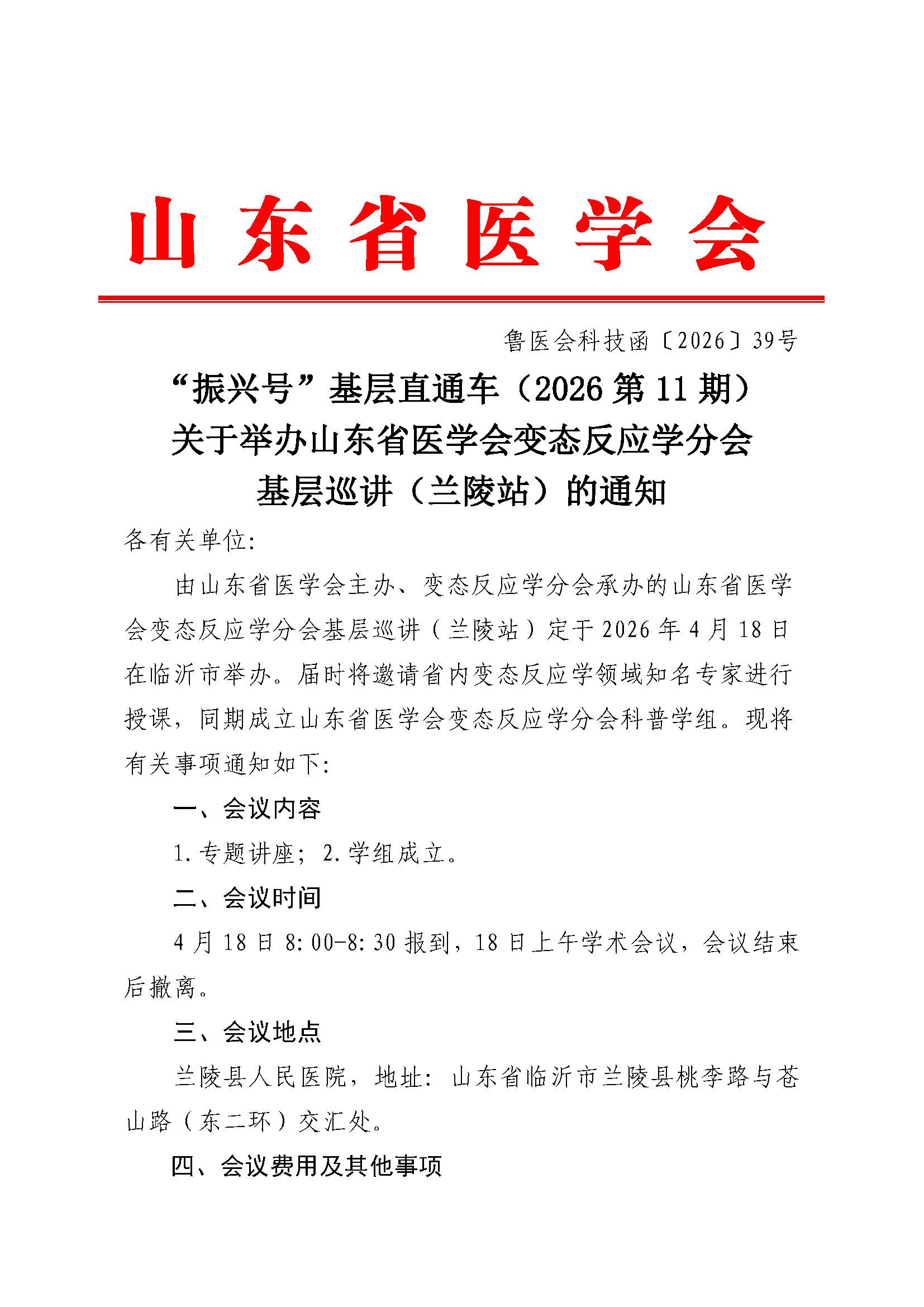 “振兴号”基层直通车(2026第11期)关于举办山东省医学会变态反应学分会基层巡讲(兰陵站)的通知
