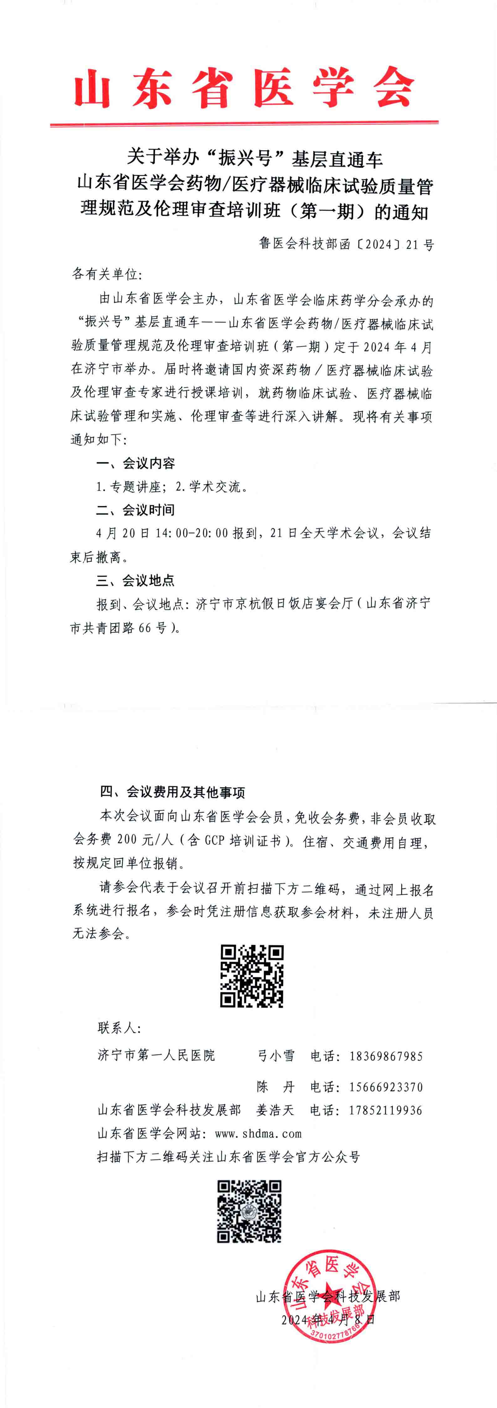 关于举办“振兴号”基层直通车山东省医学会药物/医疗器械临床试验质量管理规范及伦理审查培训班(第一期)的通知